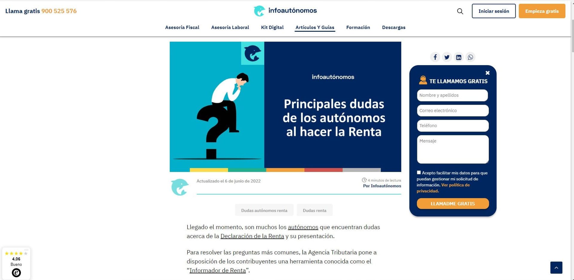 Infoautónomos emplea un pop-up de caja deslizable para ofrecerles a los usuarios un servicio de atención personalizada a través de una llamada gratis.