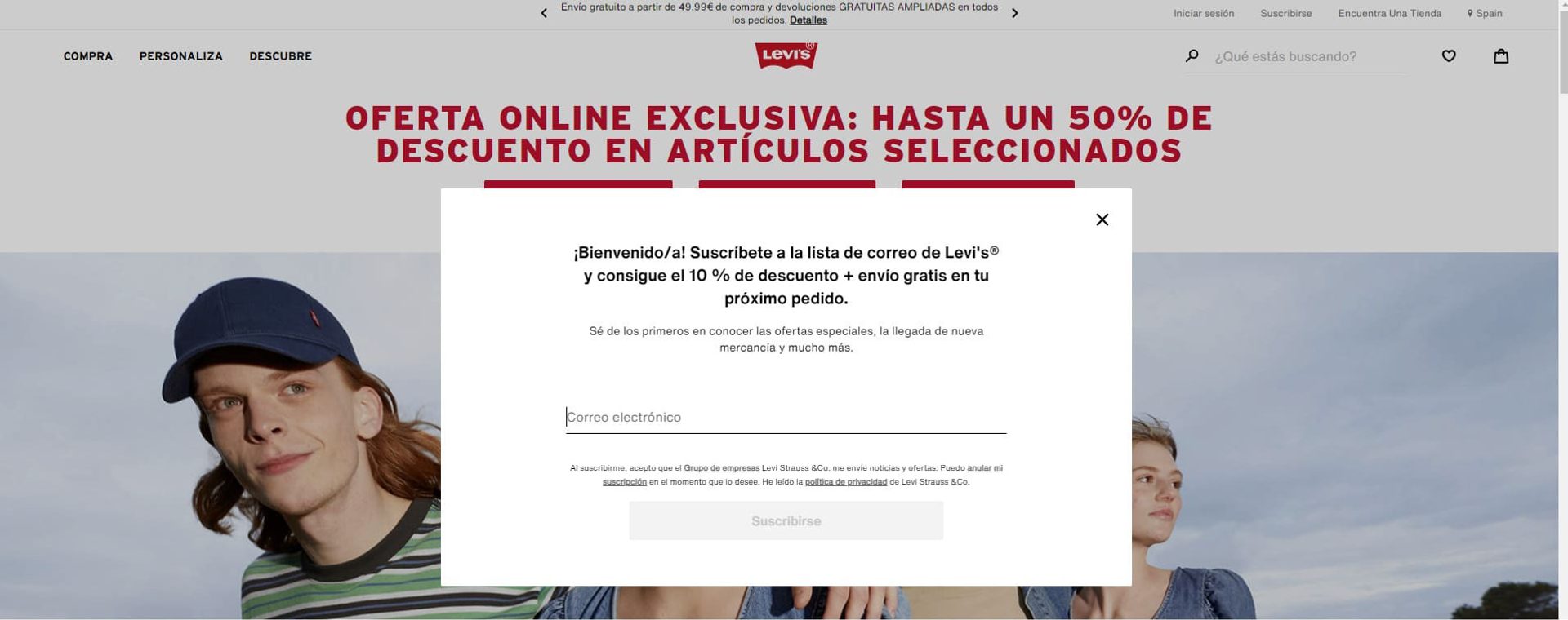 Nada más entrar a la web de Levi’s, este tipo de pop-up les da la bienvenida a los usuarios y les ofrece un 10 % de descuento y envío gratis. A cambio, la marca pide un correo electrónico, por lo que el objetivo es captar leads.