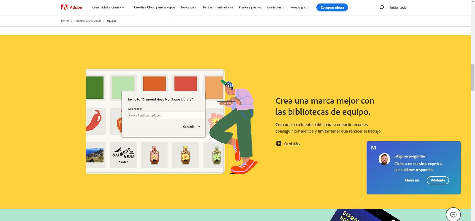 Adobe usa la caja deslizable lateral para ofrecerles ayuda a los usuarios que navegan por su web