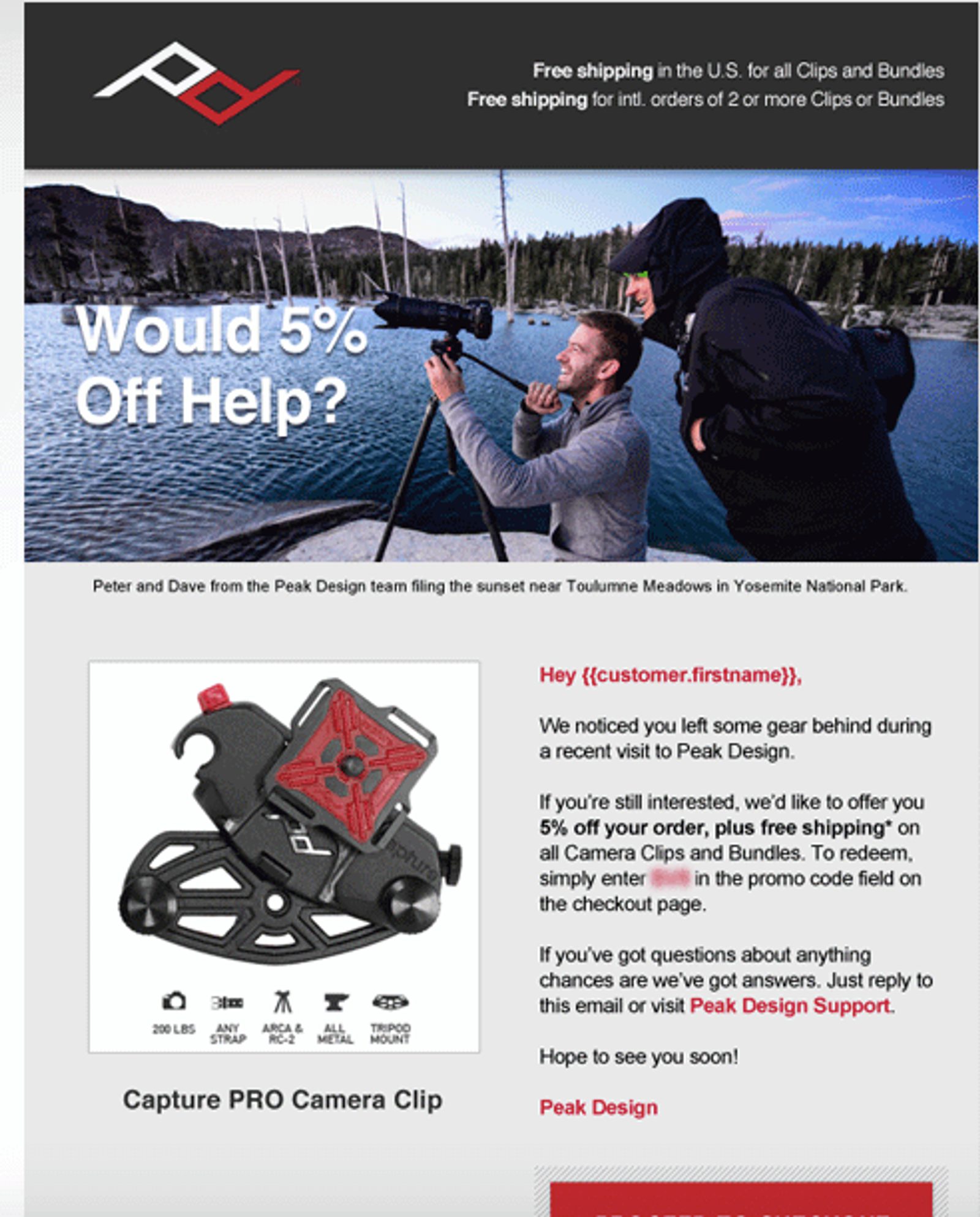 Peak Design programa su primer correo electrónico de remarketing para que se envíe 30 minutos después de que se abandona el carrito. Después, se envía un segundo correo electrónico 30 horas más tarde.