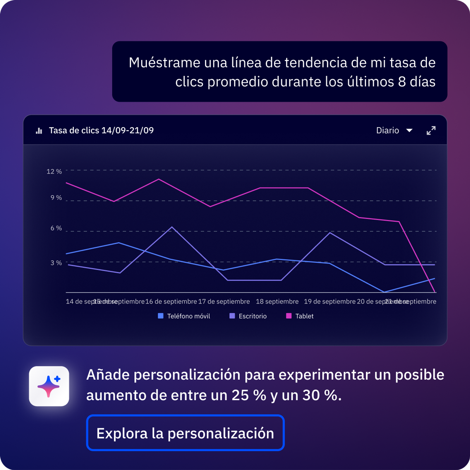 Cuando no vayas por un buen camino, la IA te recomendará exactamente qué debes ajustar. Cuando todo vaya bien, verás con precisión qué tácticas están funcionando para escalarlas. ¿El resultado? Menos tiempo interpretando datos y más tiempo implementando estrategias que generen repercusiones medibles para tu empresa.