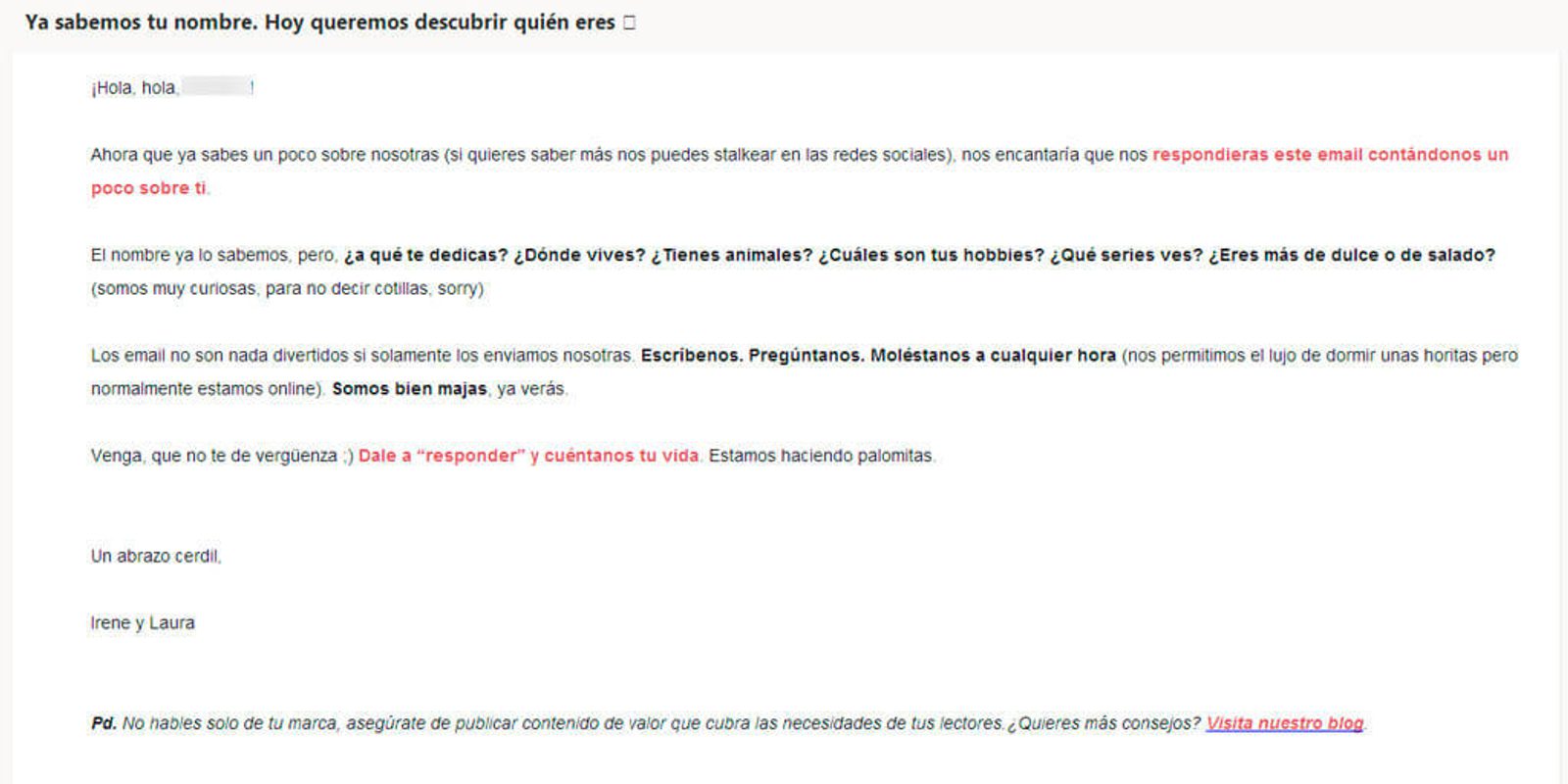 Un asunto de correo como este hará aumentar la tasa de apertura de tus emails, ya que es distinto y provocador. Al saludar, lo hace con el nombre del suscriptor, pero aclara que eso no es suficiente, por lo que anima a la persona a responder el email (y una serie de preguntas) con el objetivo de conseguir una interacción fluida.