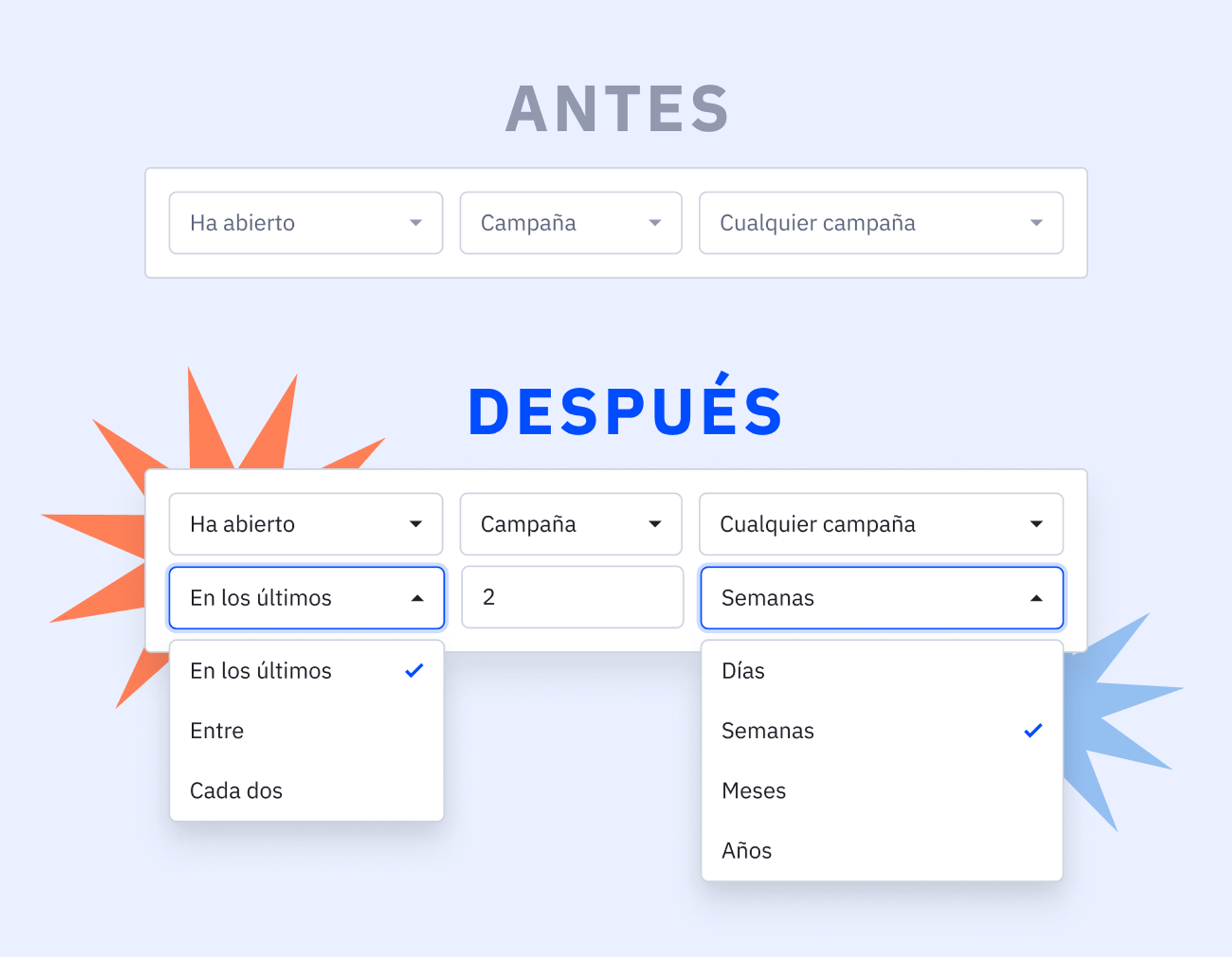 A continuación, se muestra un ejemplo de cómo ActiveCampaign muestra nuevas funciones utilizando imágenes del antes y el después.