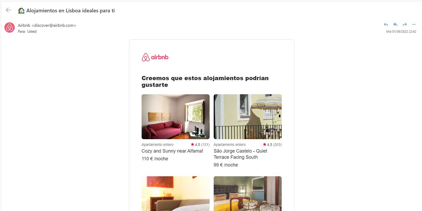 Este email de Airbnb es una muestra de cómo se puede personalizar el contenido de un email teniendo en cuenta las acciones realizadas por el receptor.