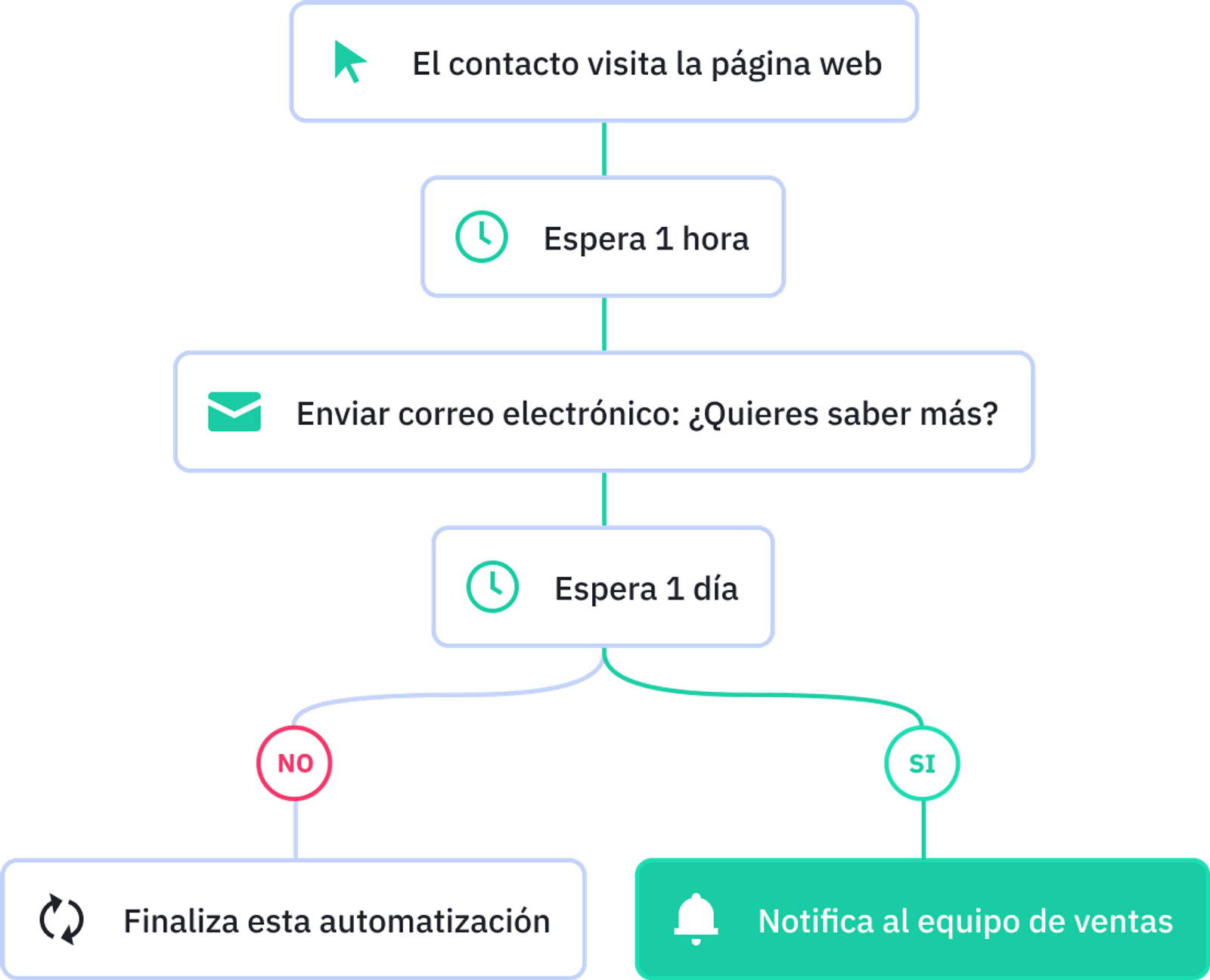 ¿Y qué hay en ese nivel superior? Flujos de automatizaciones que se desencadenan según las distintas acciones que se ejecutan. Por ejemplo, si un contacto abre un email, le llega el siguiente de la secuencia. Pero si lo abre y además clica en un enlace, recibe otro. Y si no lo abre, le llega otro correo distinto.
