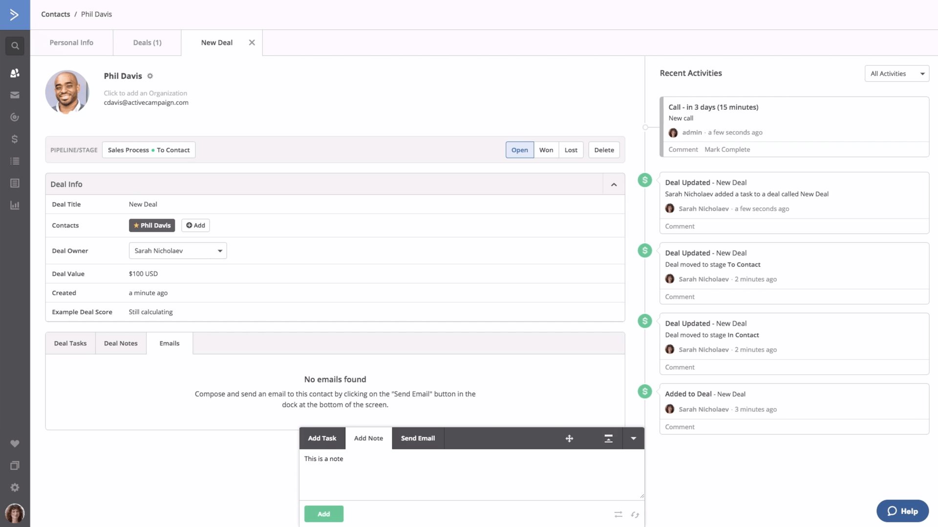 En el CRM de ActiveCampaign, puedes ver todo el historial de un lead desde su registro de contacto. Incluye notas, asigna tareas a tu equipo de ventas, observa la información de las operaciones y los datos completos de tu contacto, todo desde un solo lugar. Fuente: ActiveCampaign.