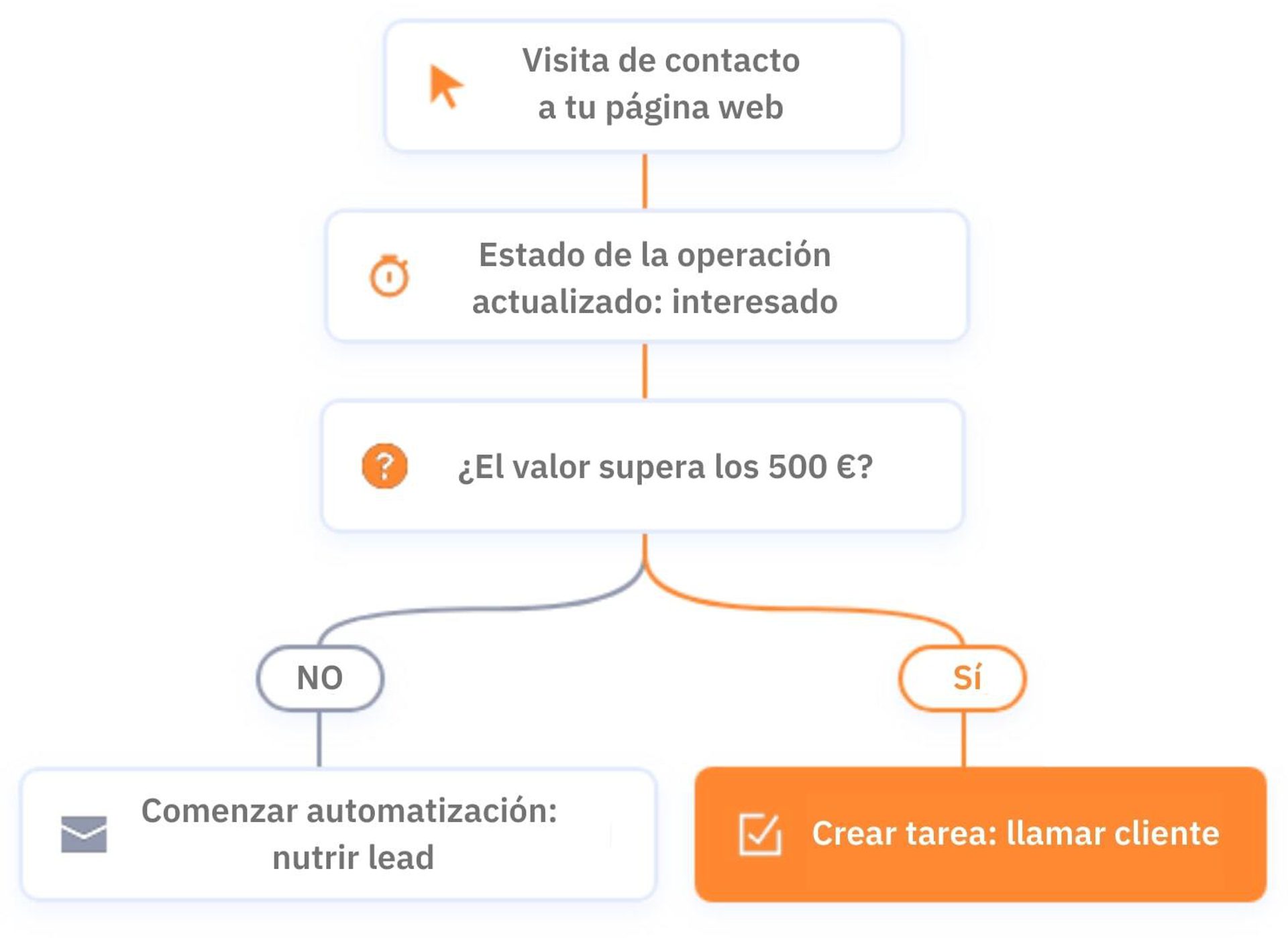 Si el valor de la operación supera los 500 €, el CRM asignará automáticamente una tarea para que un agente de ventas llame al lead. Si el valor de la operación está por debajo de los 500 €, el lead automáticamente ingresa a una campaña de nutrición de leads.