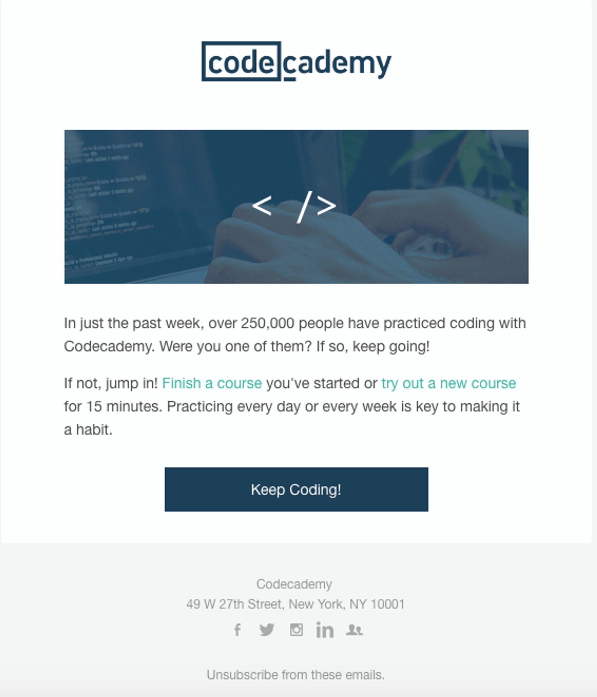 Este correo electrónico de CodeCademy hace que sea muy difícil resistirse al miedo de quedarse afuera.