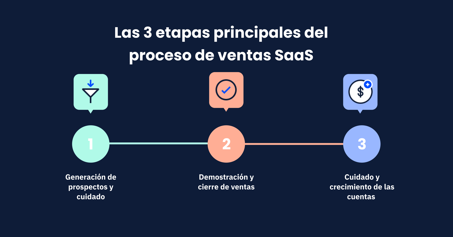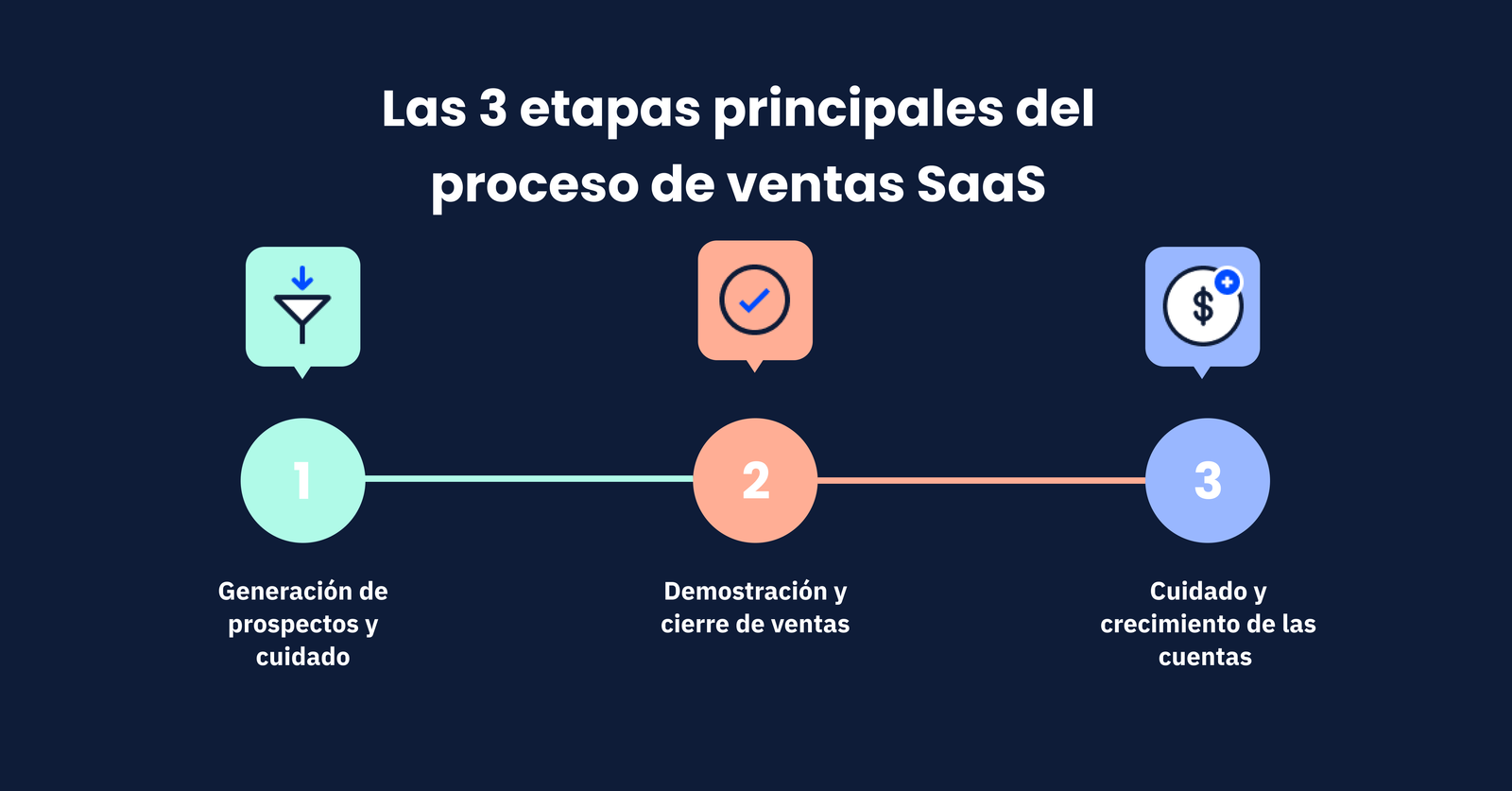 Al más alto nivel, el proceso de ventas SaaS se divide en tres fases principales: