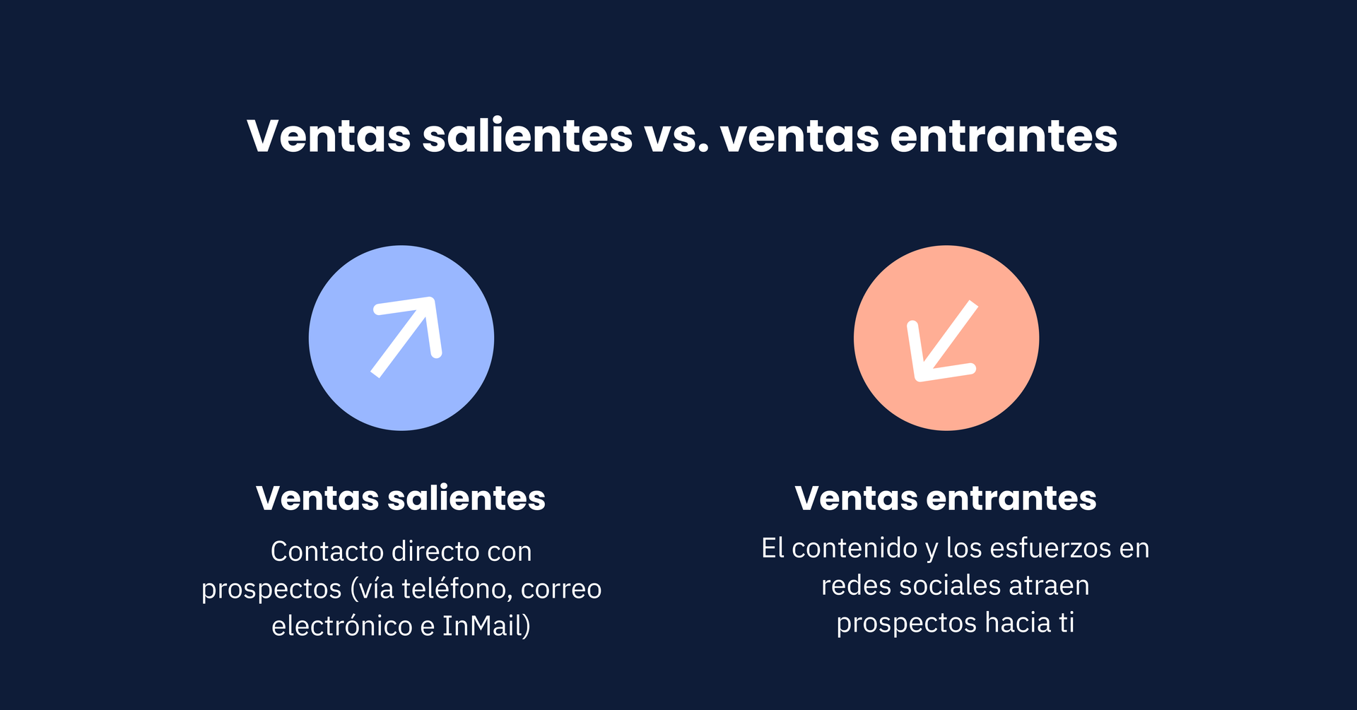 En el mundo entrante, el enfoque es atraer prospectos a tu empresa. Los equipos de marketing son responsables de la generación de prospectos, aunque los SDR (representantes del desarrollo de ventas) suelen precalificar a los prospectos antes de que se realice una demostración.
