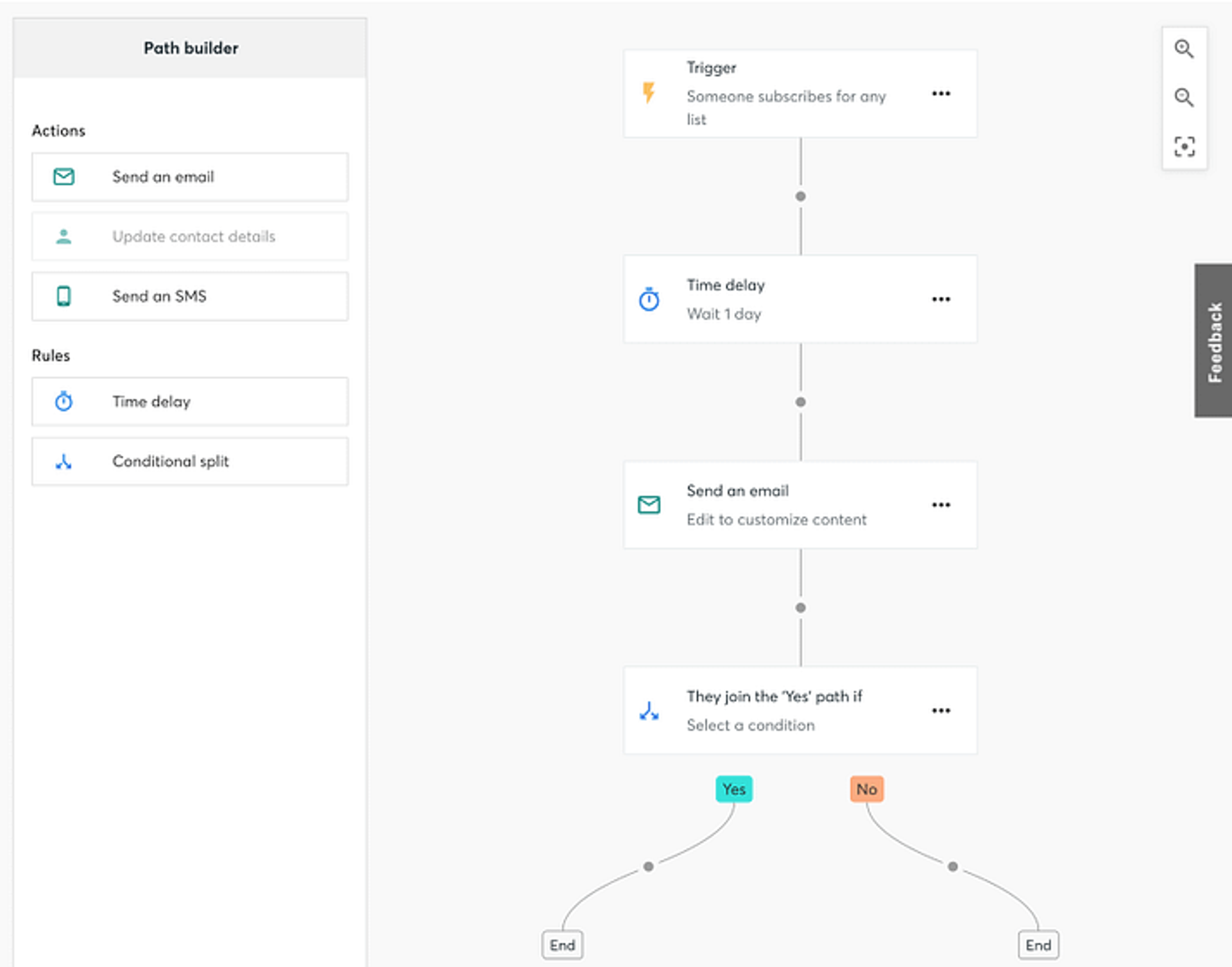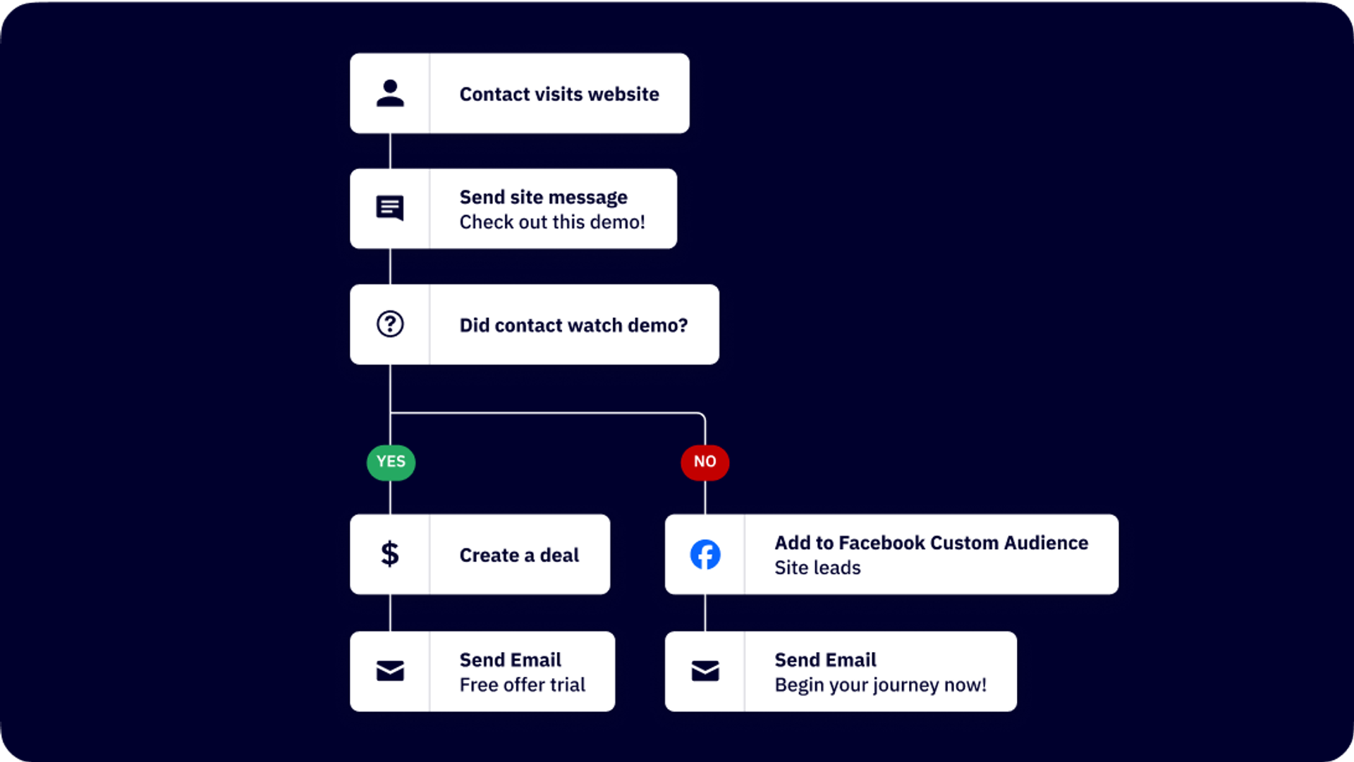 - Flujos de trabajo de automatización avanzados: crea flujos de trabajo de varios pasos que incluyan correos electrónicos, SMS, mensajes del sitio y acciones de CRM, todo ello desencadenado por comportamientos específicos de los clientes.