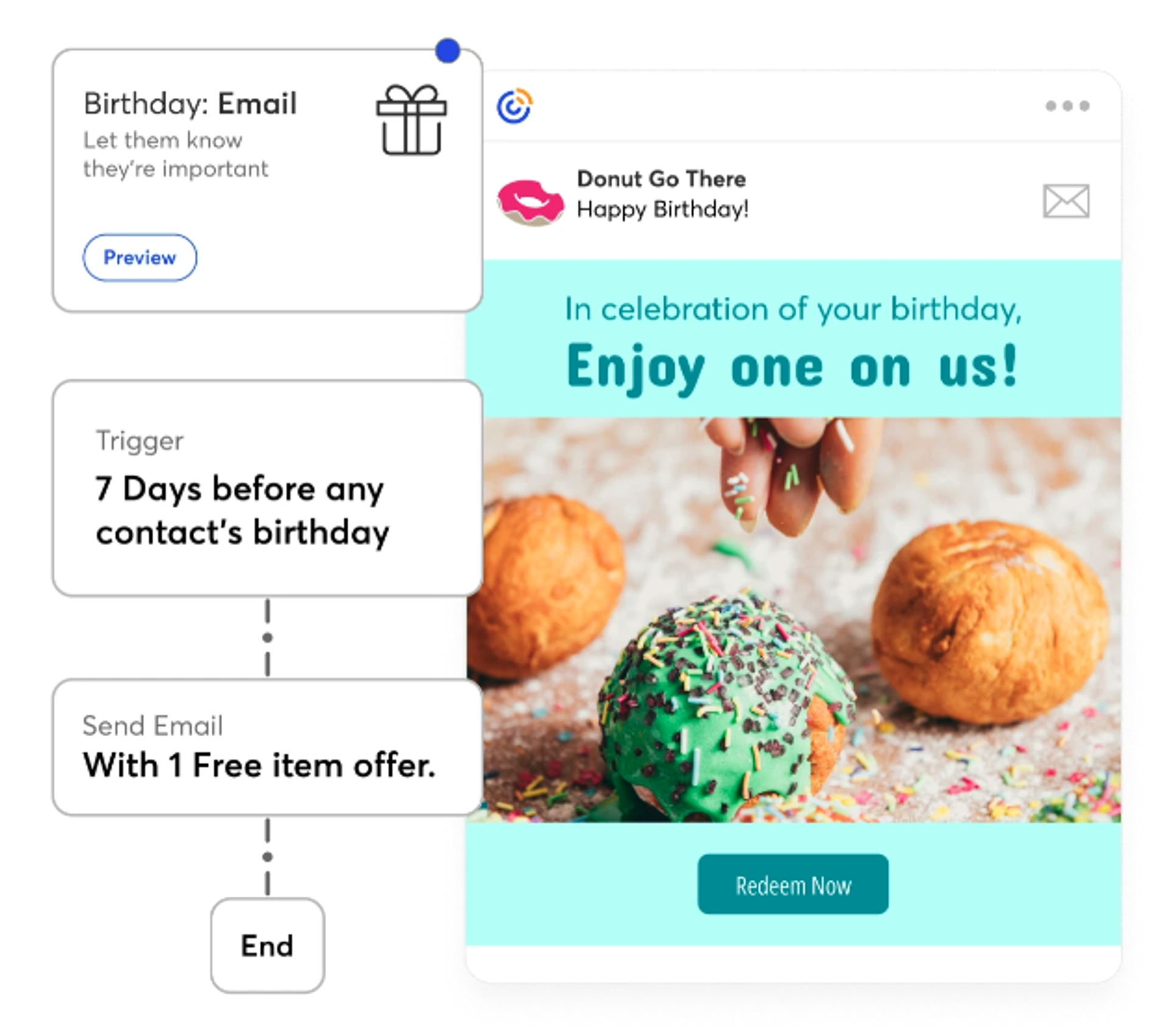 Por su parte, Constant Contact mantiene sus herramientas de automatización bastante sencillas. Es ideal si buscas una automatización básica, como la configuración de correos electrónicos de bienvenida, felicitaciones de cumpleaños o campañas por goteo sencillas. Puedes automatizar los seguimientos en función de desencadenantes sencillos, como cuando alguien se inscribe en tu lista o hace clic en un correo electrónico. Aunque estas funciones son fáciles de usar y perfectas para pequeñas empresas o principiantes, no ofrecen la misma profundidad de automatización o personalización que ActiveCampaign.