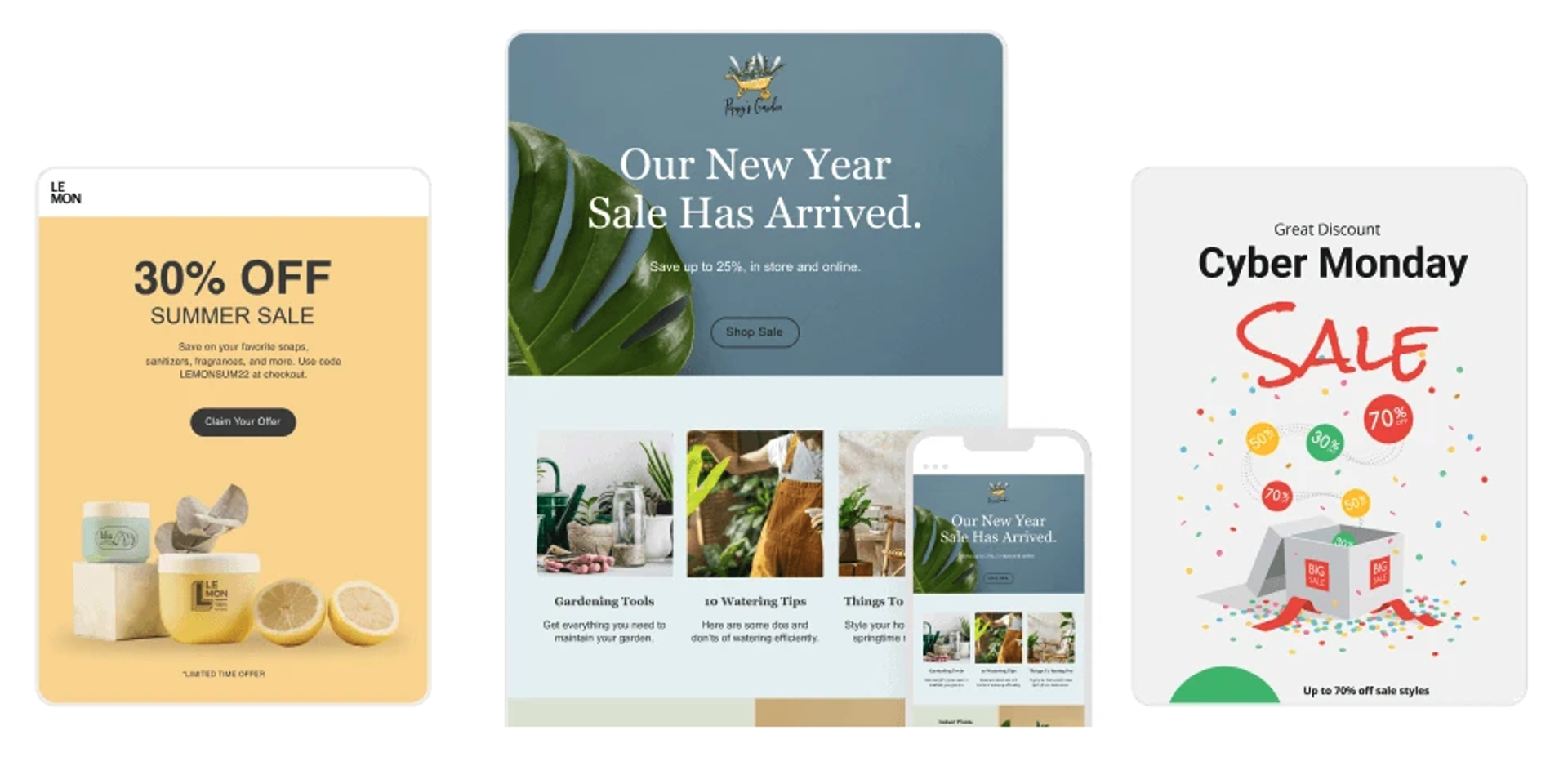 - Plantillas de correo electrónico y personalización: empieza con una biblioteca de plantillas profesionales o diseña las tuyas desde cero. El creador de arrastrar y soltar facilita la creación de mensajes de correo electrónico atractivos y acordes con la marca sin necesidad de tener un título en diseño.