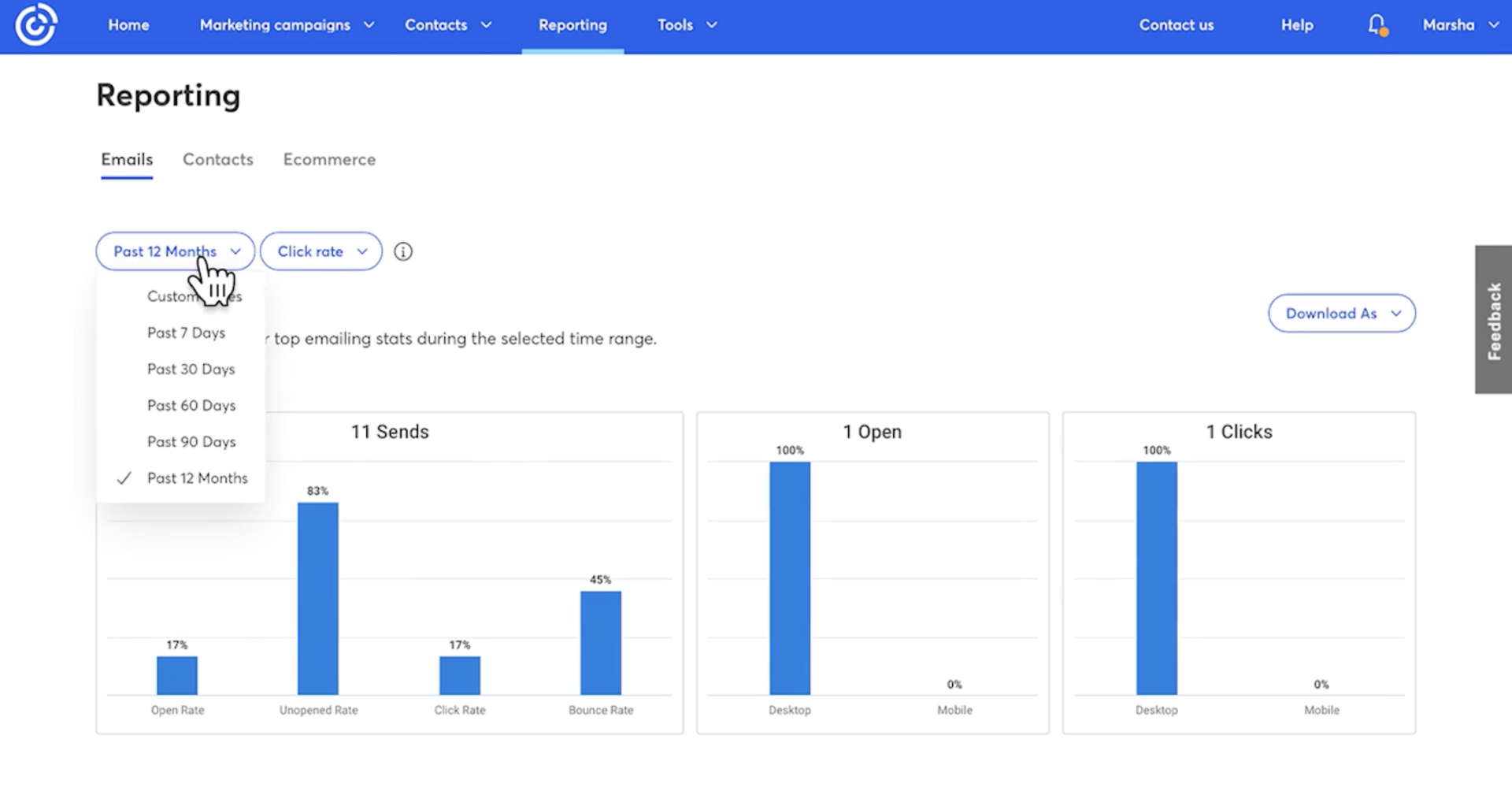 - Informes y análisis: obtén información sobre métricas básicas, como las tasas de apertura, las tasas de clics y las tasas de rebote. Realiza un seguimiento del rendimiento a lo largo del tiempo para ver cómo van tus correos electrónicos e identificar áreas de mejora.
