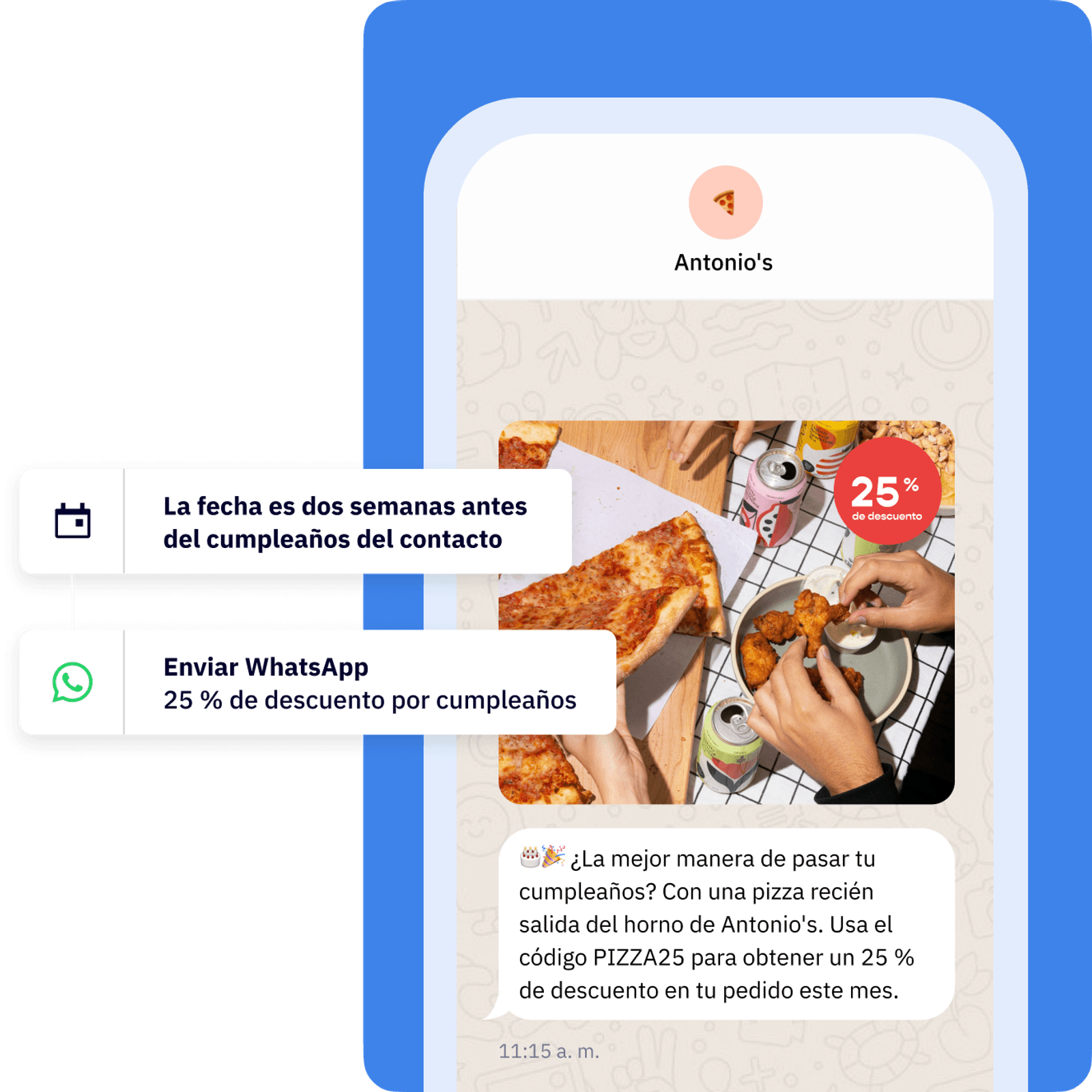 Crea conversaciones individuales y personalizadas con la automatización inteligente. La mensajería de WhatsApp te permite chatear constantemente con tus clientes, independientemente de si es tu canal principal o una extensión de tus campañas