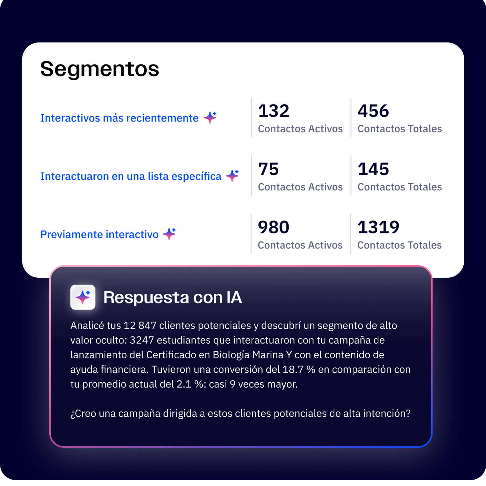 Pregúntale a la IA cuáles son las oportunidades con mayores repercusiones en tus iniciativas de marketing y los agentes te brindarán una respuesta instantánea optimizada para el éxito.