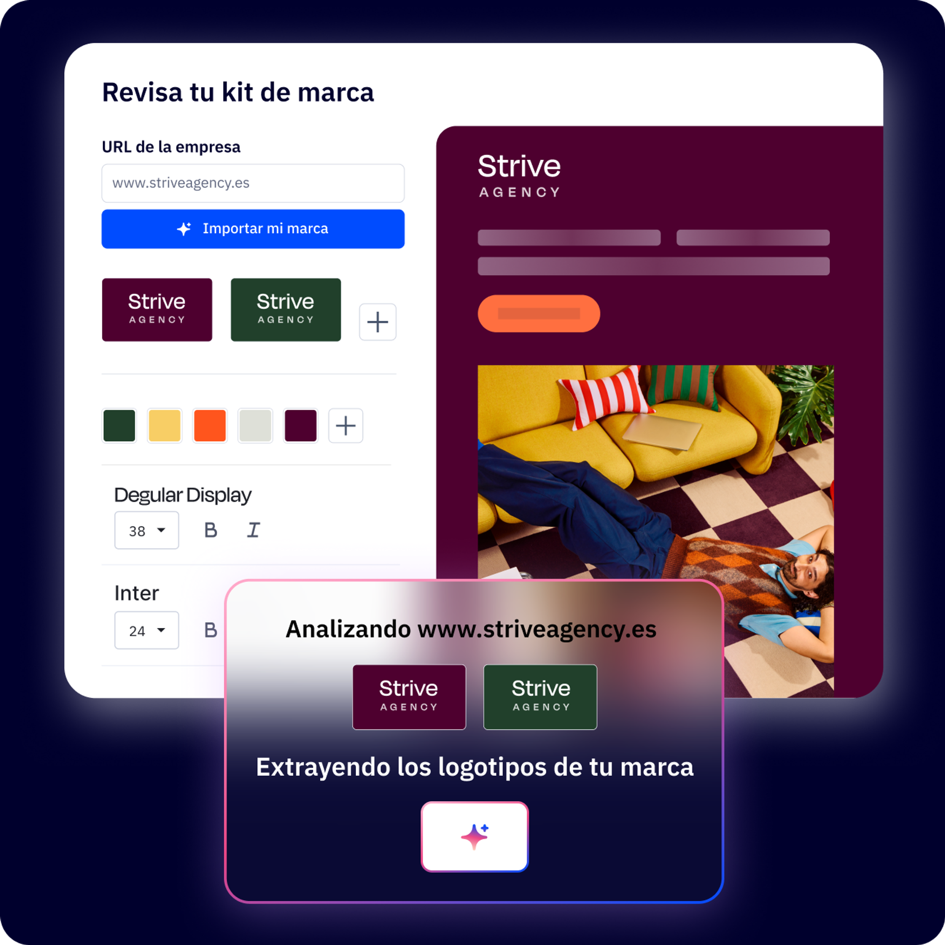 Olvídate del formato y ve directo al envío. Importa la identidad de tu marca desde tu sitio web en cuestión de segundos.