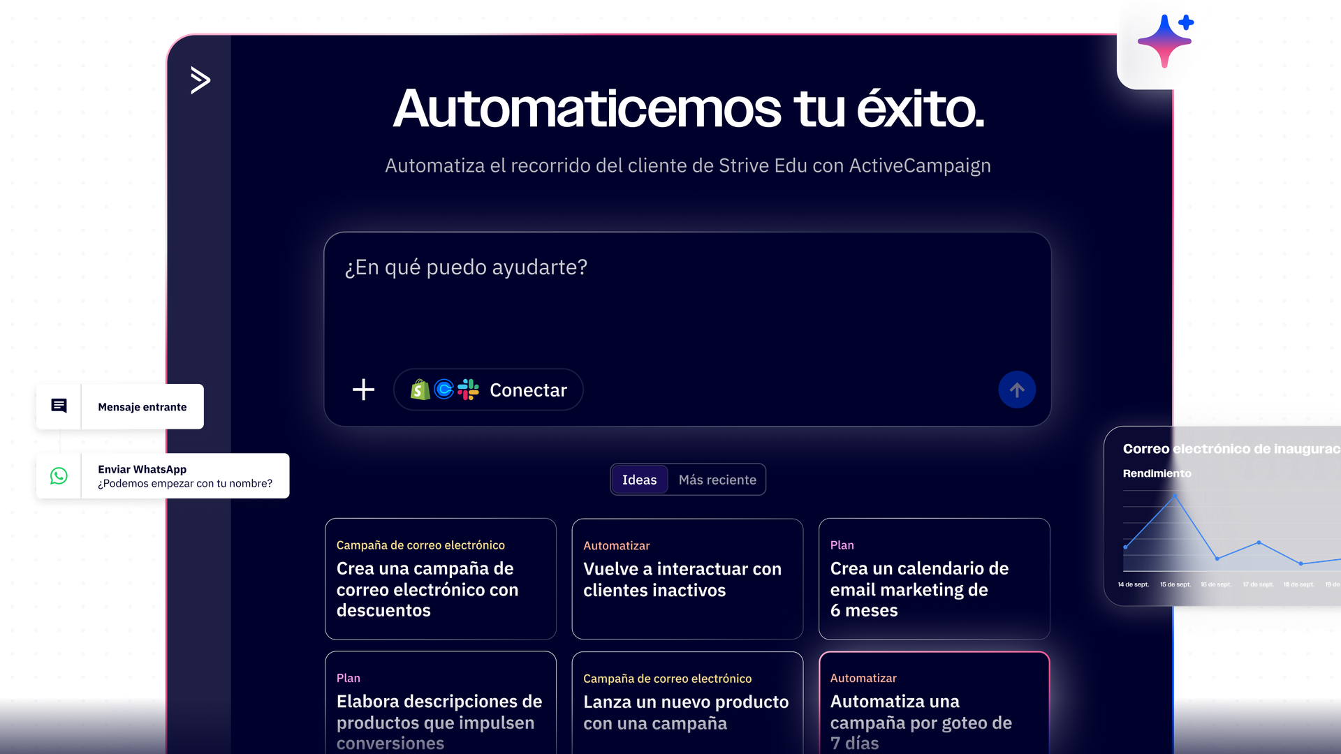 Aprovecha la inteligencia adaptable para generar contenido, estrategias e ideas que se adapten a tus objetivos y tu público. Más rápido que nunca, con inspiración ilimitada al alcance de la mano.