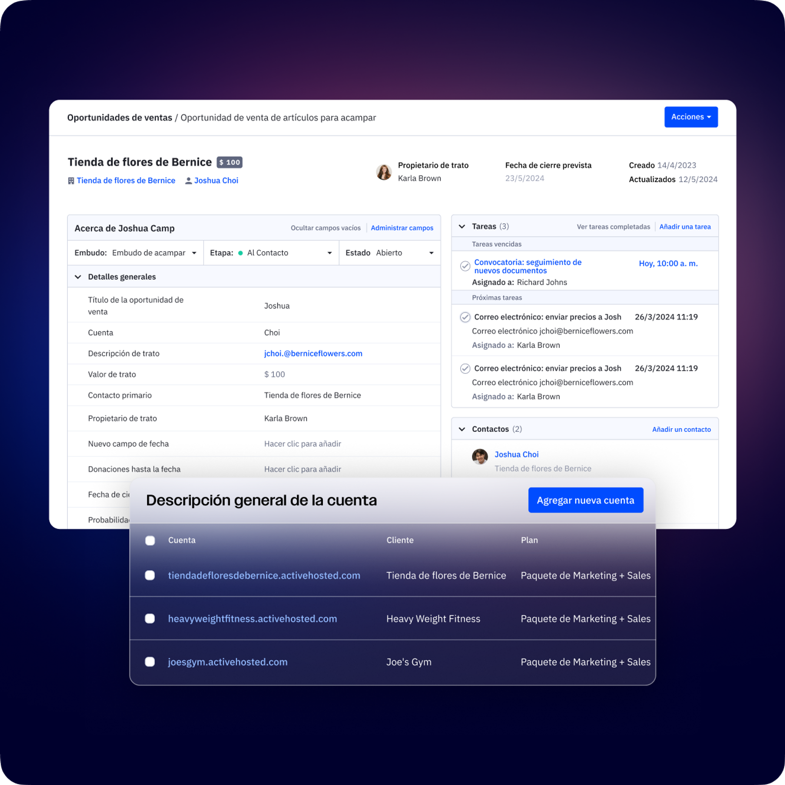 Gestionas múltiples campañas, listas de contactos e identidades de marca al mismo tiempo (además de hacer un seguimiento de tus propios públicos). Con el CRM integrado de ActiveCampaign, esto es más fácil que nunca.