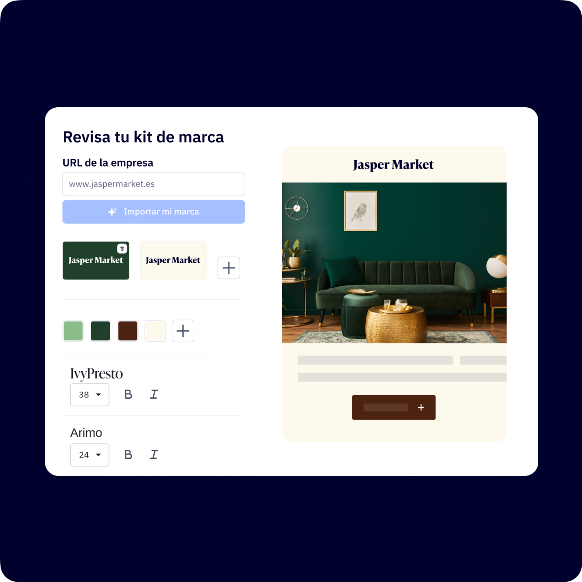 Con nuestro agente de importación de kits de marca, solo se necesitan unos pocos segundos para incluir todas las fuentes y colores de tus clientes en ActiveCampaign y comenzar a crear correos electrónicos.