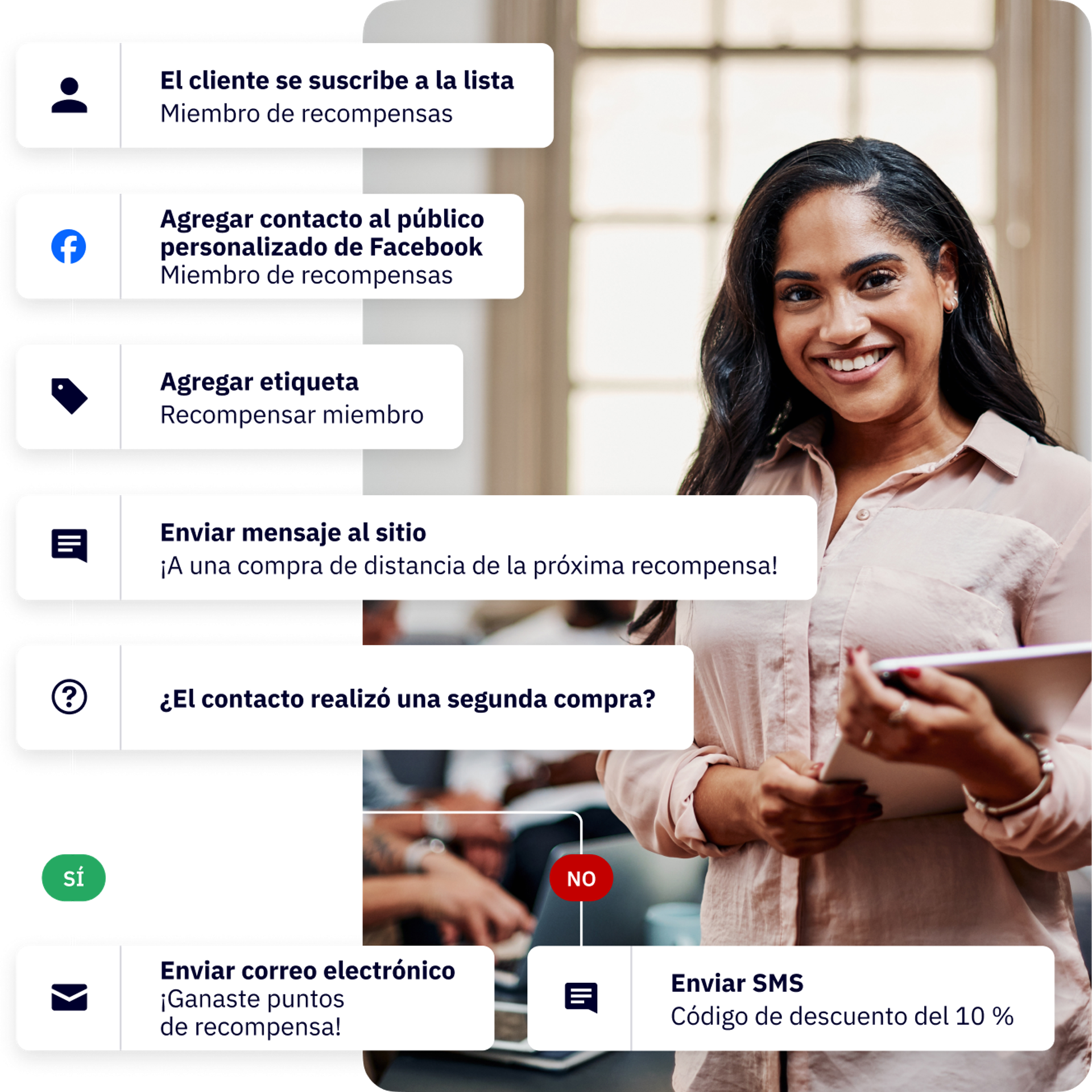 Llega a tu público en los canales que más usan. Supera los límites de las campañas de correo electrónico y llega a tu público sobre la marcha con la automatización nativa de SMS y WhatsApp, y más de 950 integraciones en apps.
