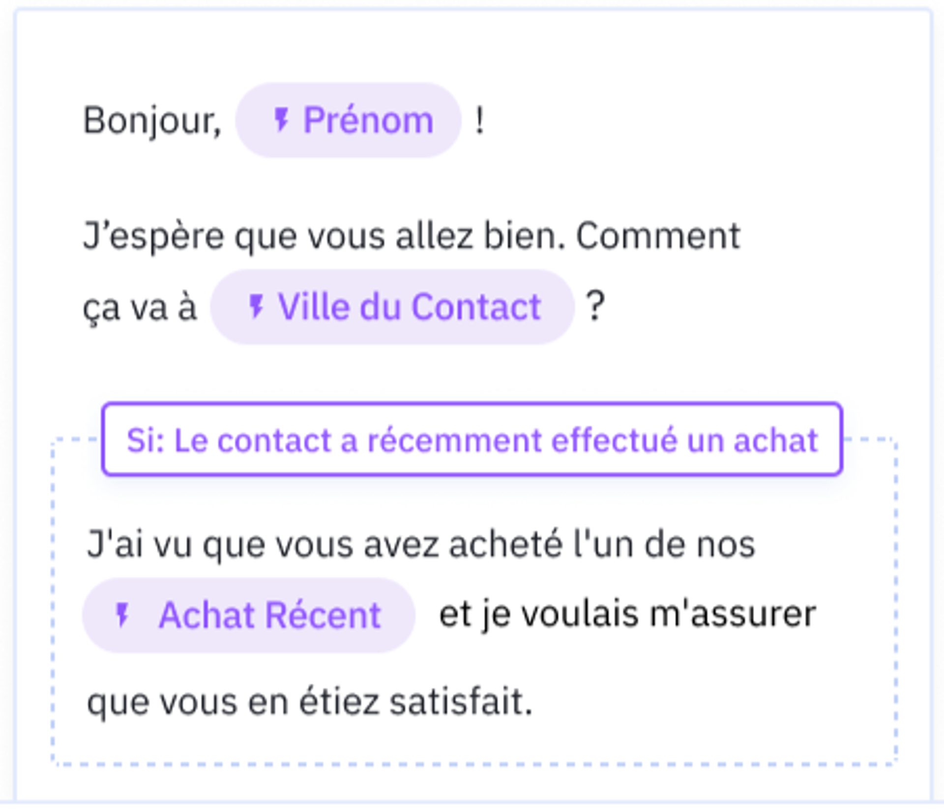 La meilleure façon de personnaliser votre relation avec vos clients est de bien les connaître, à travers l'exploitation des données que vous avez recueillies. Des informations telles que les noms, dates d'anniversaires, préférences, etc. sont des détails que vous allez utiliser et dont vous devez vous souvenir lorsque vous interagissez avec vos clients.
