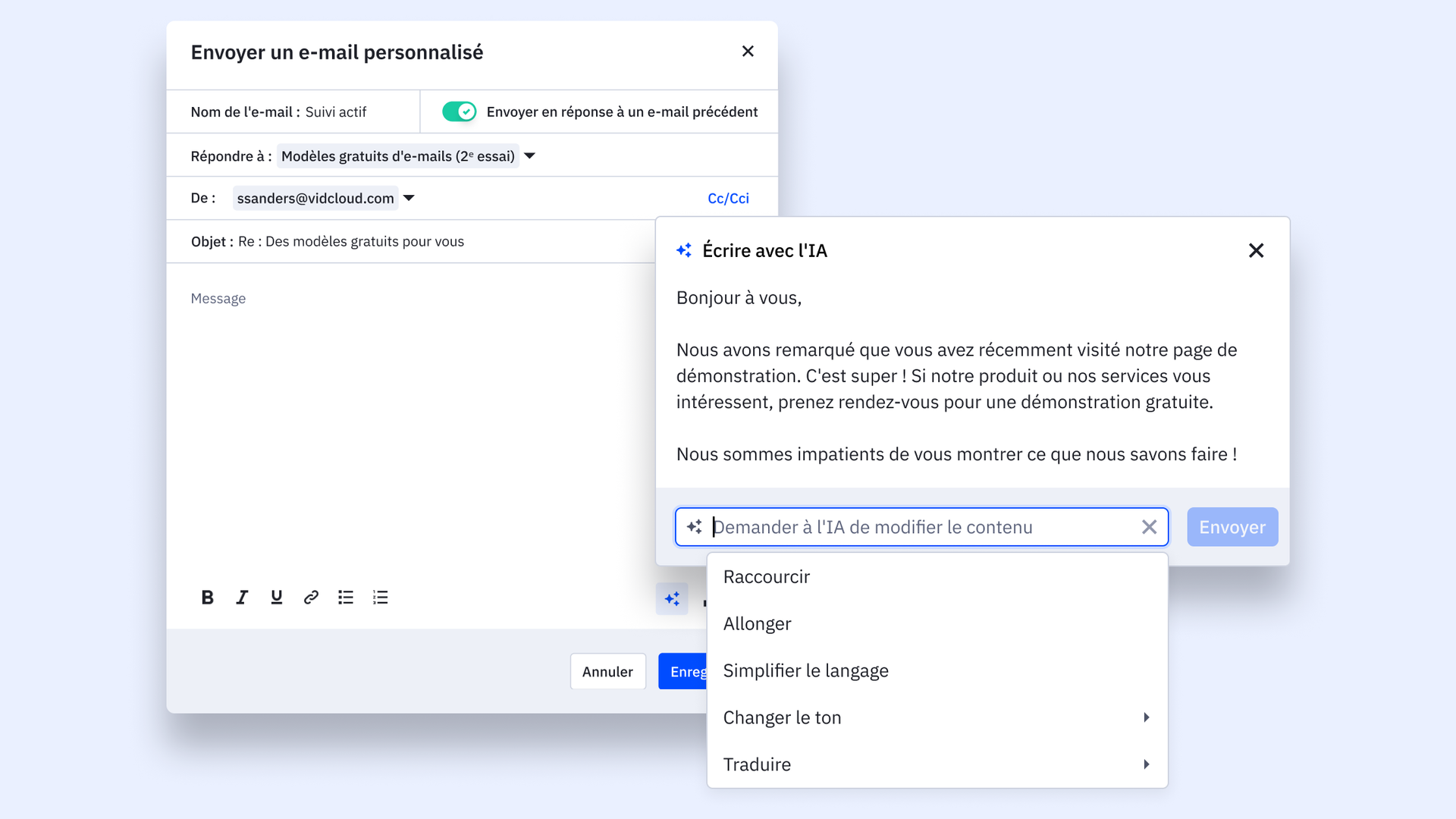 En plus d’utiliser l’IA pour générer du contenu pour vos campagnes marketing, vous pouvez désormais générer du contenu pour vos e-mails de prospection personnalisés automatisés, vos réponses standard enregistrées et vos e-mails directs personnalisés envoyés via des comptes e-mail connectés, ce qui vous permet d’économiser du temps et de l’énergie.