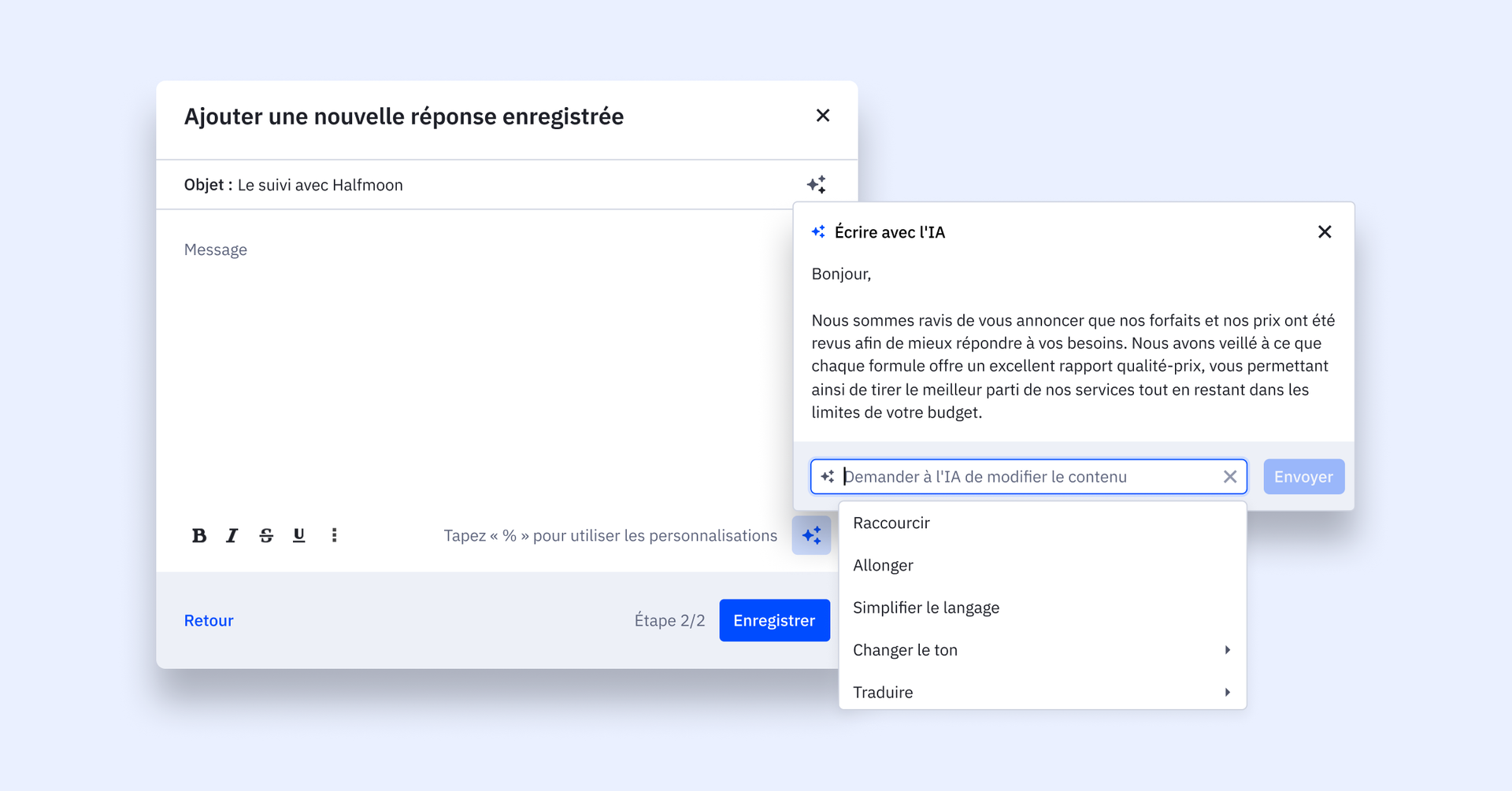 Si vous souhaitez modifier ou ajuster le contenu généré, il vous suffit de faire part de vos remarques et l’IA améliorera ses suggestions en conséquence. Cette boucle de rétroaction garantit que le contenu s’aligne parfaitement sur le ton et le style de votre marque.