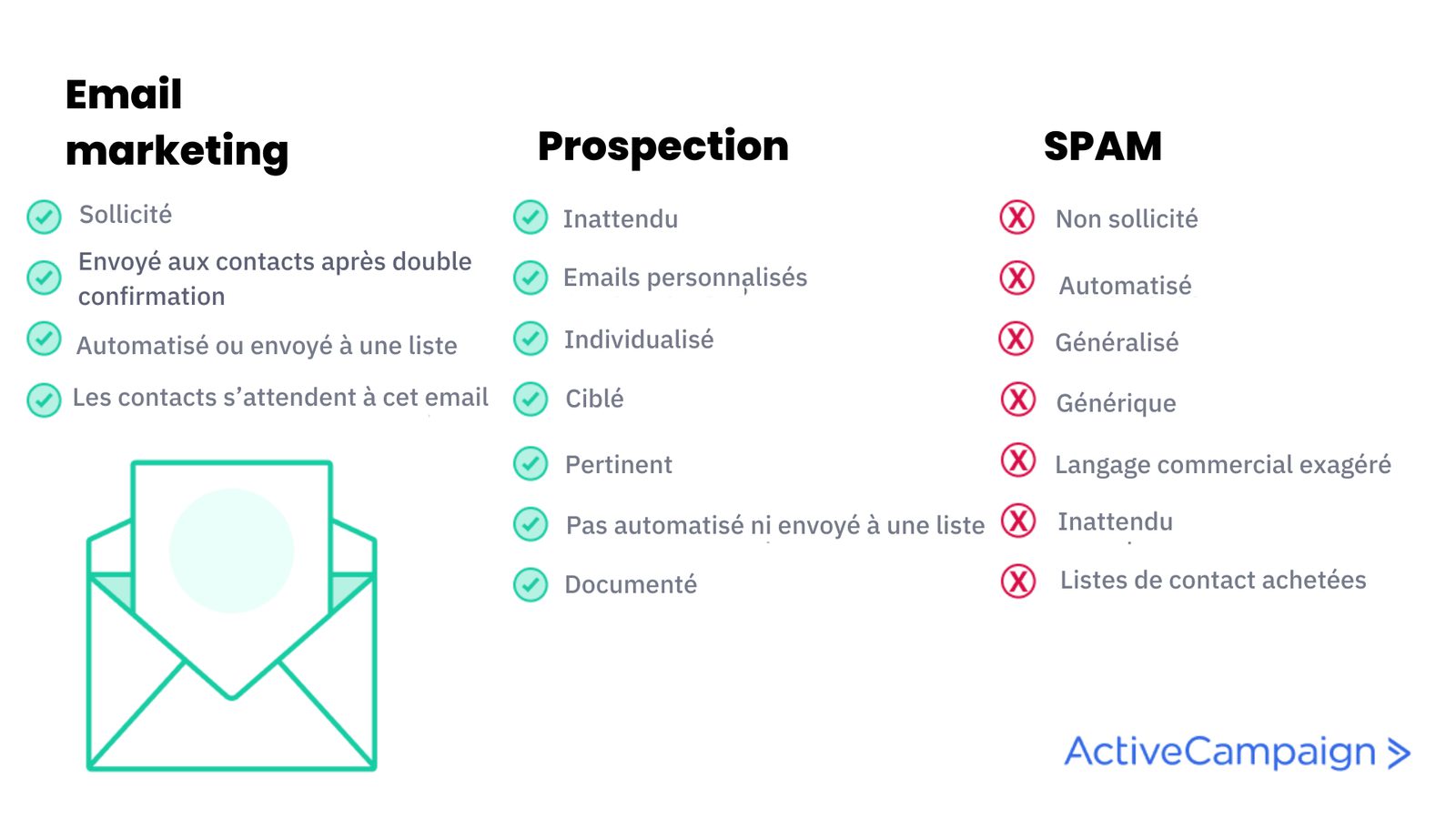 À l’inverse des campagnes d'e-mail marketing destinées à des listes d’abonné·es, vous ne pouvez pas envoyer un e-mail de démarchage à une liste de clients potentiels. Sinon, vous n’envoyez pas un e-mail de prospection. Vous envoyez un e-mail indésirable, donc du spam.