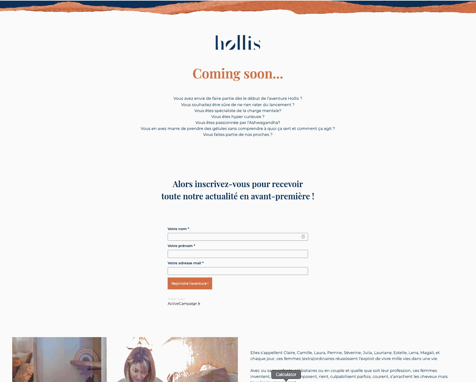 Elle a donc utilisé Pages, l’outil de page de renvoi ActiveCampaign, afin que les contacts puissent recevoir les mises à jour et rester au courant de l’évolution de Hollis, avant même que l’entreprise ne soit entrée sur le marché. Grâce à Pages, Mathilde a pu rapidement bénéficier d’une page de renvoi élégante et unique à sa marque, et ce, en l’espace de quelques clics.