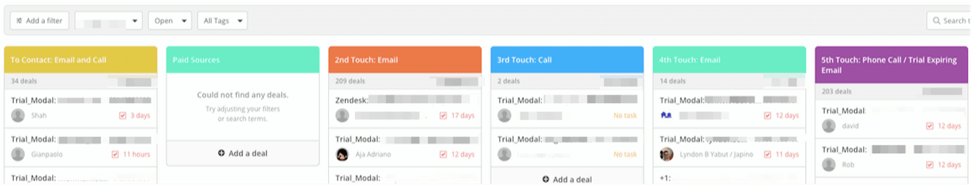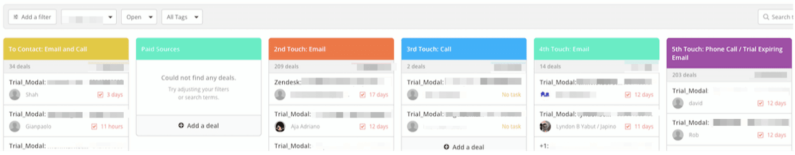 Un pipeline CRM ActiveCampaign montrant un processus de communication client.