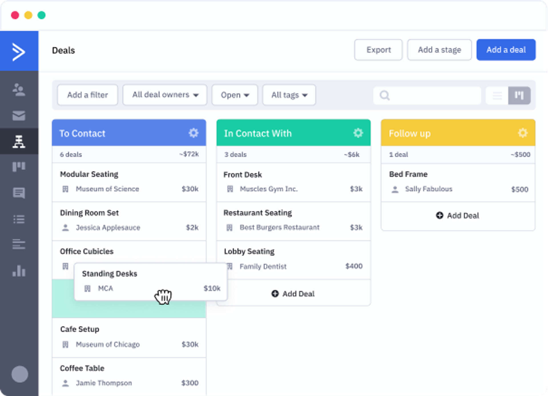 - Le suivi des interactions : la planification des envois d'e-mails et des rappels de rendez-vous et de relances pour gérer le pipeline de vente et ne plus manquer aucune opportunité de vente.