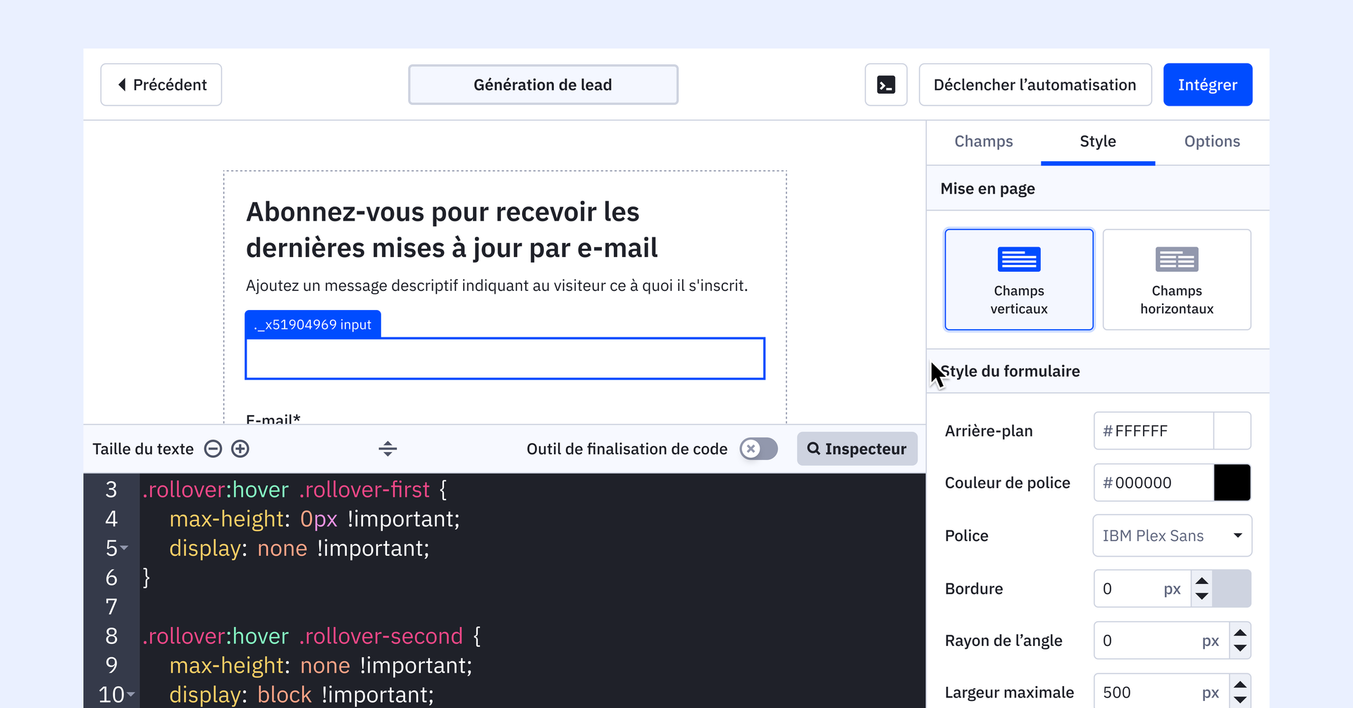 Créez des formulaires attrayants à l’aide de notre générateur de formulaires ou personnalisez-les facilement selon votre design spécifique à l’aide de CSS. Découvrez un éventail plus large d’options de personnalisation grâce à l’introduction d’un panneau de code plus grand pour les CSS personnalisés et d’un mode inspecteur amélioré, qui vous permet de modifier le design et les éléments visuels de votre formulaire.