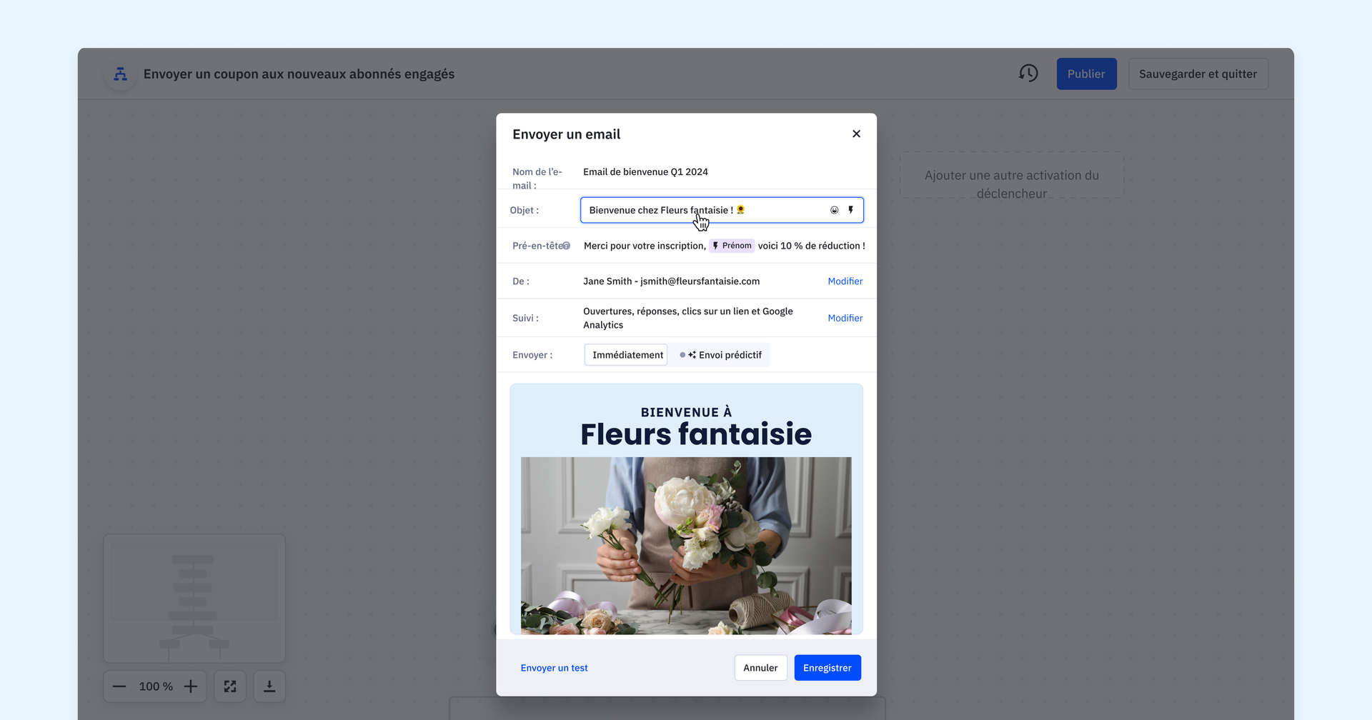 - Édition contextuelle des actions d'envoi : Nous mettons à jour nos actions d'envoi afin que vous puissiez les modifier directement dans le concepteur d'automatisation sans quitter votre workflow. Cette édition contextuelle rationalise votre processus d'automatisation des e-mails, des SMS et des notifications internes, ce qui vous permet de rester concentré et de maintenir votre flux créatif dans le concepteur d'automatisation.