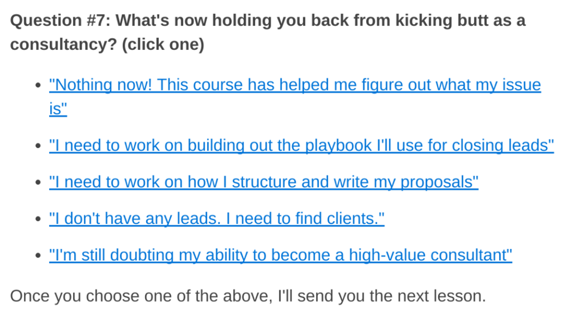 La plupart des lecteurs ne regardent pas votre offre en disant consciemment « non ». En fait, ils n'envisageaient jamais vraiment votre offre en premier lieu. « Entraîner la prise de décision », c'est féliciter les gens pour avoir agi, ou les forcer à prendre une décision consciente (au lieu de vous ignorer passivement).