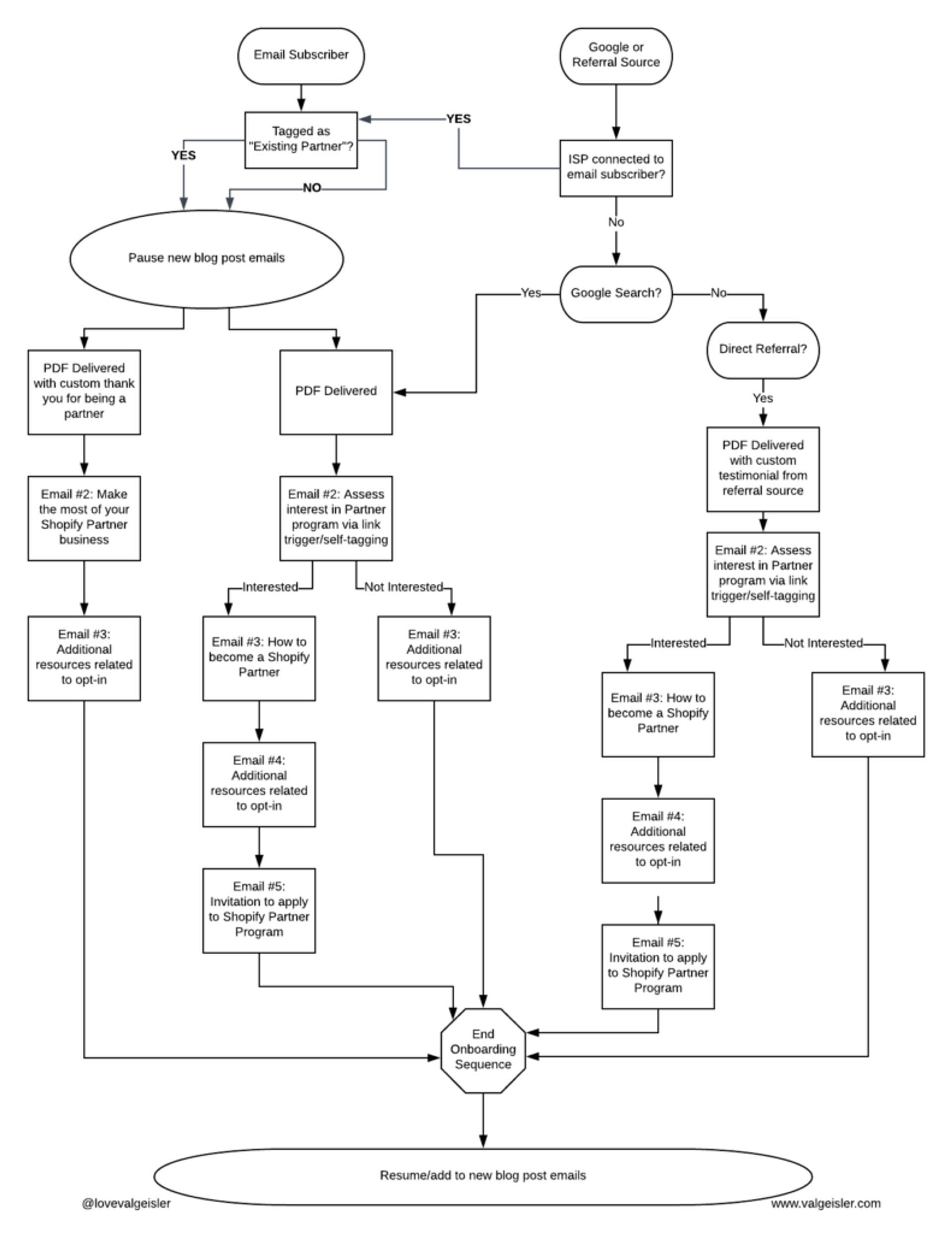Un autre exemple ? L'expert en e-mails, Val Geisler, a démonté la séquence d'intégration de Shopify. Elle recommandait que Shopify cartographie différents tunnels de conversion en fonction de la provenance des abonnés.