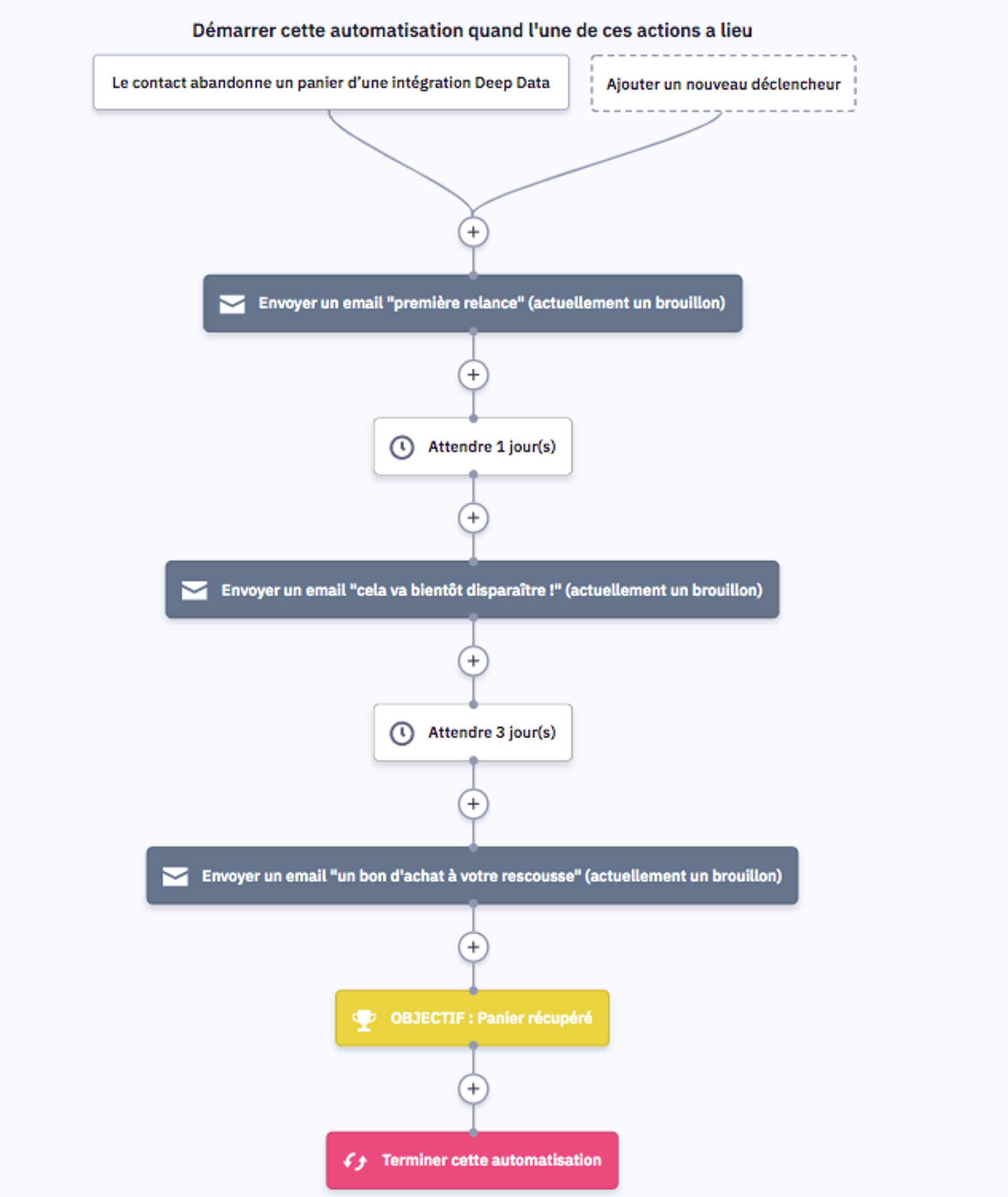 Lorsqu'un contact récupère son panier, l’étape d’objectif permet de suivre ce succès. Vous pouvez envisager d'envoyer un e-mail de remerciement personnalisé aux personnes qui récupèrent leur panier avec succès.