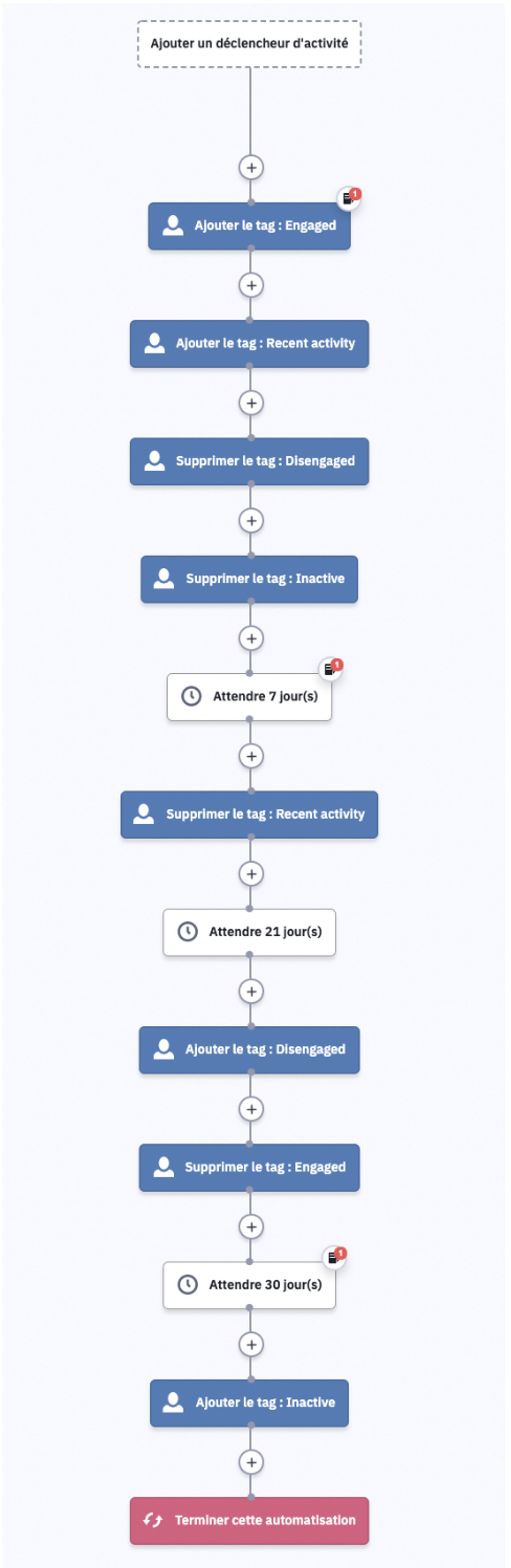 Quand il s’agit de segmentation de l'engagement email, il est préférable d'utiliser des tags. Les tags reflètent le niveau d'engagement d'un contact au moment exact, mais ils permettent également des changements de statut lorsqu'un contact interagit avec le cycle de vie de l'engagement.
