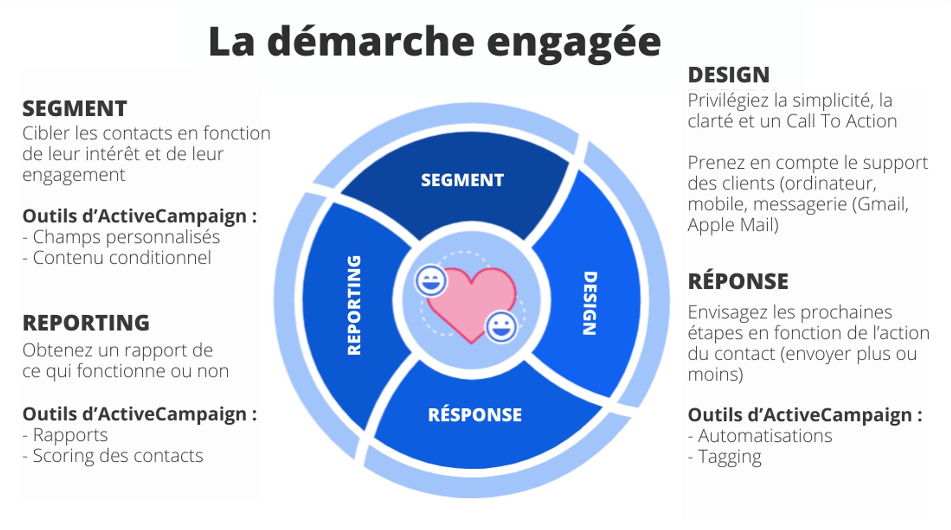 - Réponse : quels types d'actions vos contacts entreprennent-ils ? Que ne font-ils pas ? Choisissez vos prochaines étapes en fonction des ouvertures et des clics.