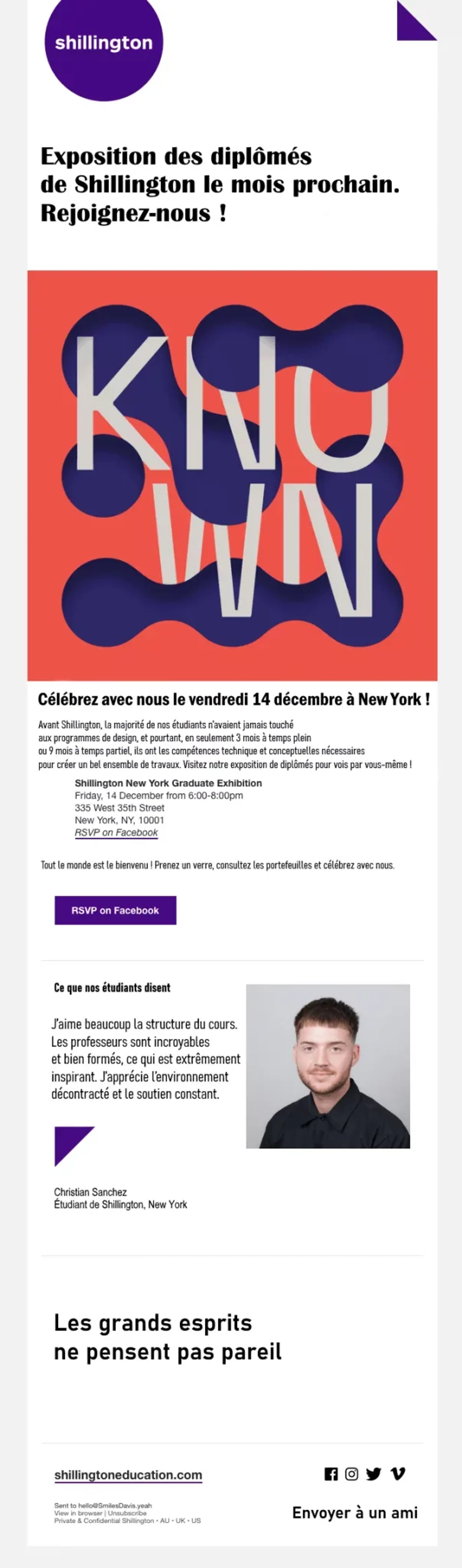 Un e-mail d’invitation à un évènement comme celui de Shillington Education utilise un témoignage d’un ancien participant pour vous influencer positivement.