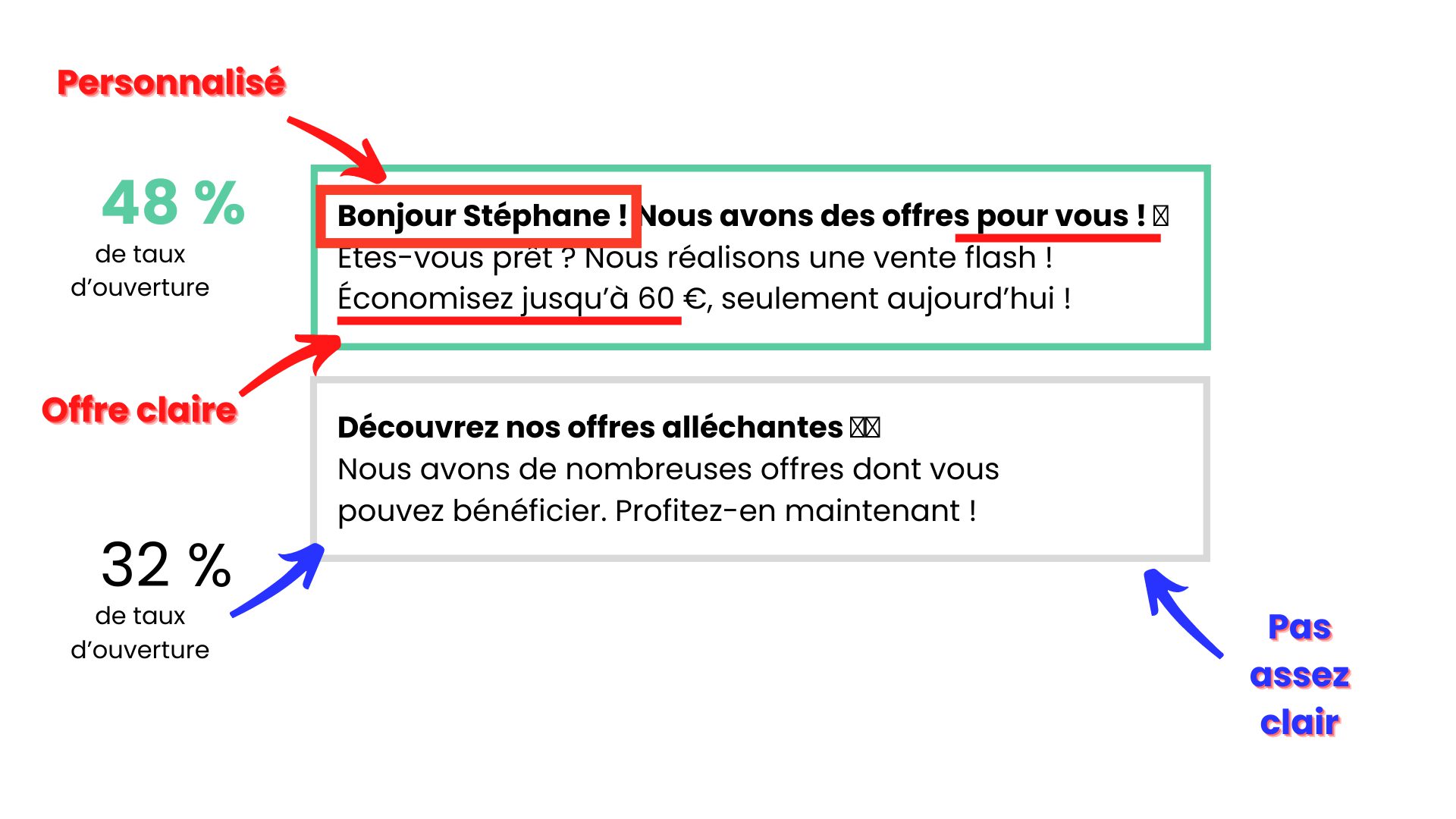 Un e-mail personnalisé augmente les taux d’ouverture de jusqu’à 6 fois par rapport a un message générique.