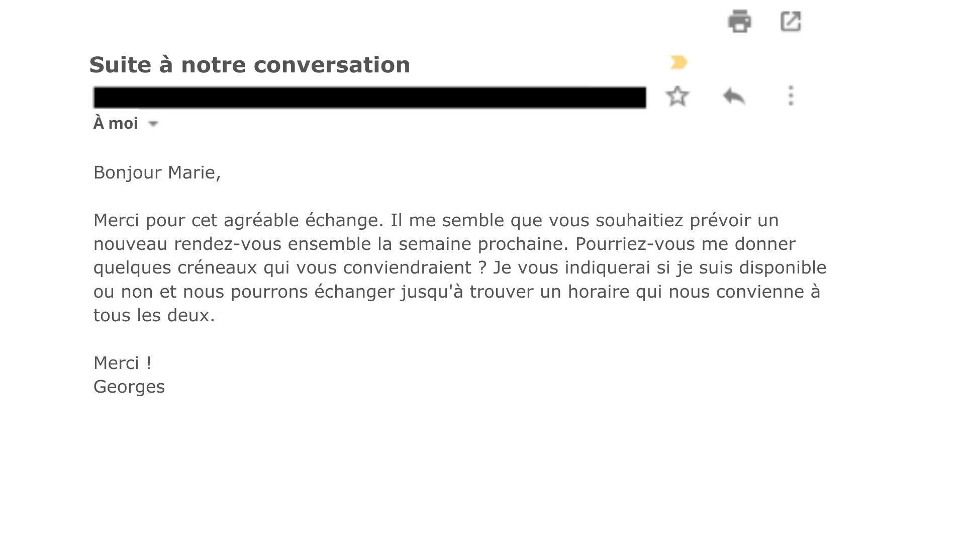 Georges vous demande d’ouvrir votre agenda, de trouver plusieurs dates et créneaux qui vous conviennent, d’écrire un e-mail avec vos propositions, de l’envoyer, puis d’attendre sa réponse. Si vos créneaux ne lui conviennent pas, il en suggérera de nouveaux, en espérant que vous serez disponible.