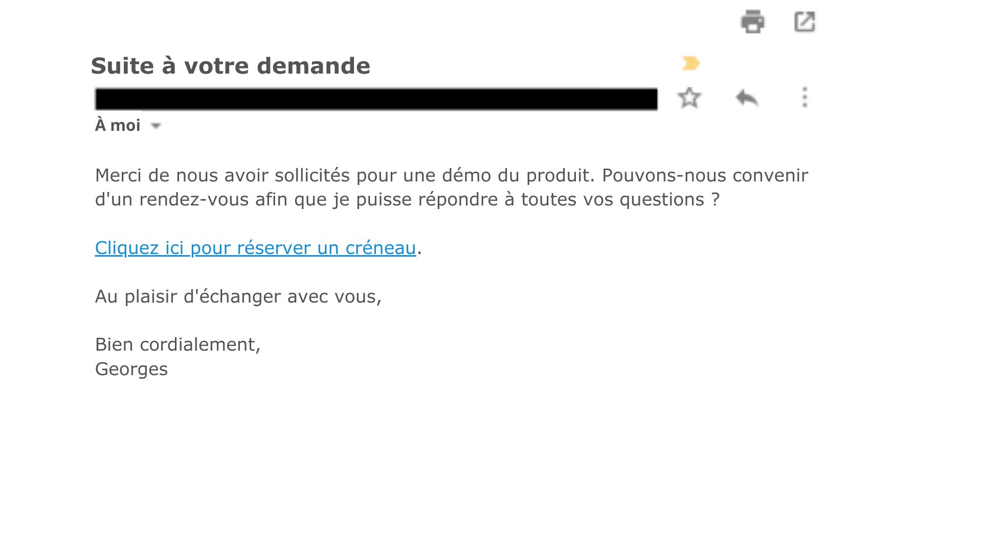 Les prospects peuvent prendre contact avec vous de différentes manières : par e-mail, via le formulaire du site, etc. Pour répondre à leur demande en leur proposant un rendez-vous, cet exemple d’e-mail est une excellente base. Comme vous le verrez, il est rédigé d’une manière très généraliste pour correspondre à toutes sortes de rendez-vous. Nous vous recommandons de le personnaliser pour l’adapter à l’image de marque et au ton de votre entreprise, ainsi qu’à son offre.