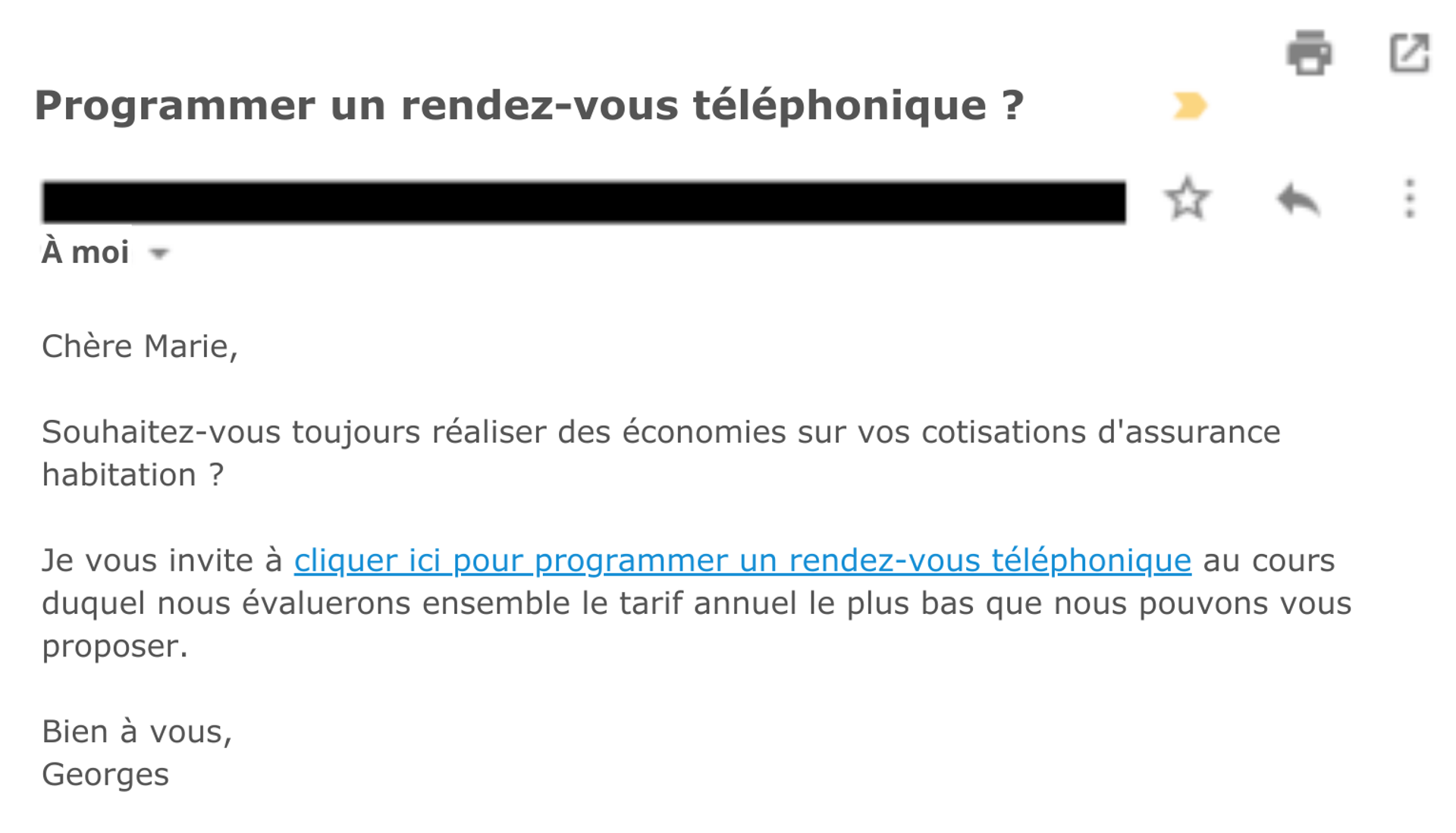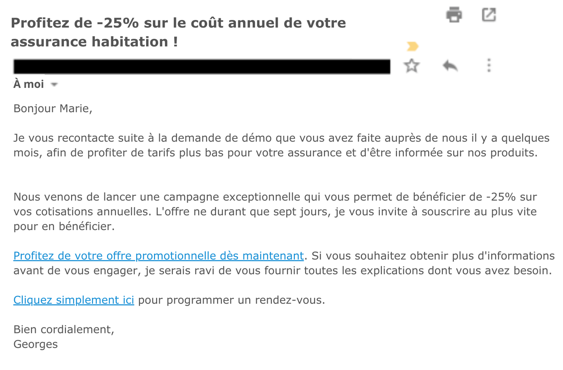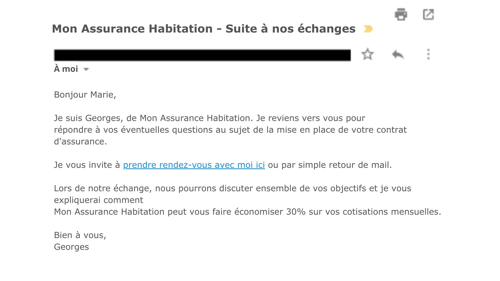 Mais il termine son e-mail par une approche différente. Ici, sa proposition de valeur est claire : lorsqu’ils discuteront, Georges montrera à Marie comment le programme peut lui faire réaliser 30% d’économies sur ses cotisations mensuelles. Une offre alléchante comme celle-ci peut faire des miracles lorsqu’il s’agit de convaincre un prospect.