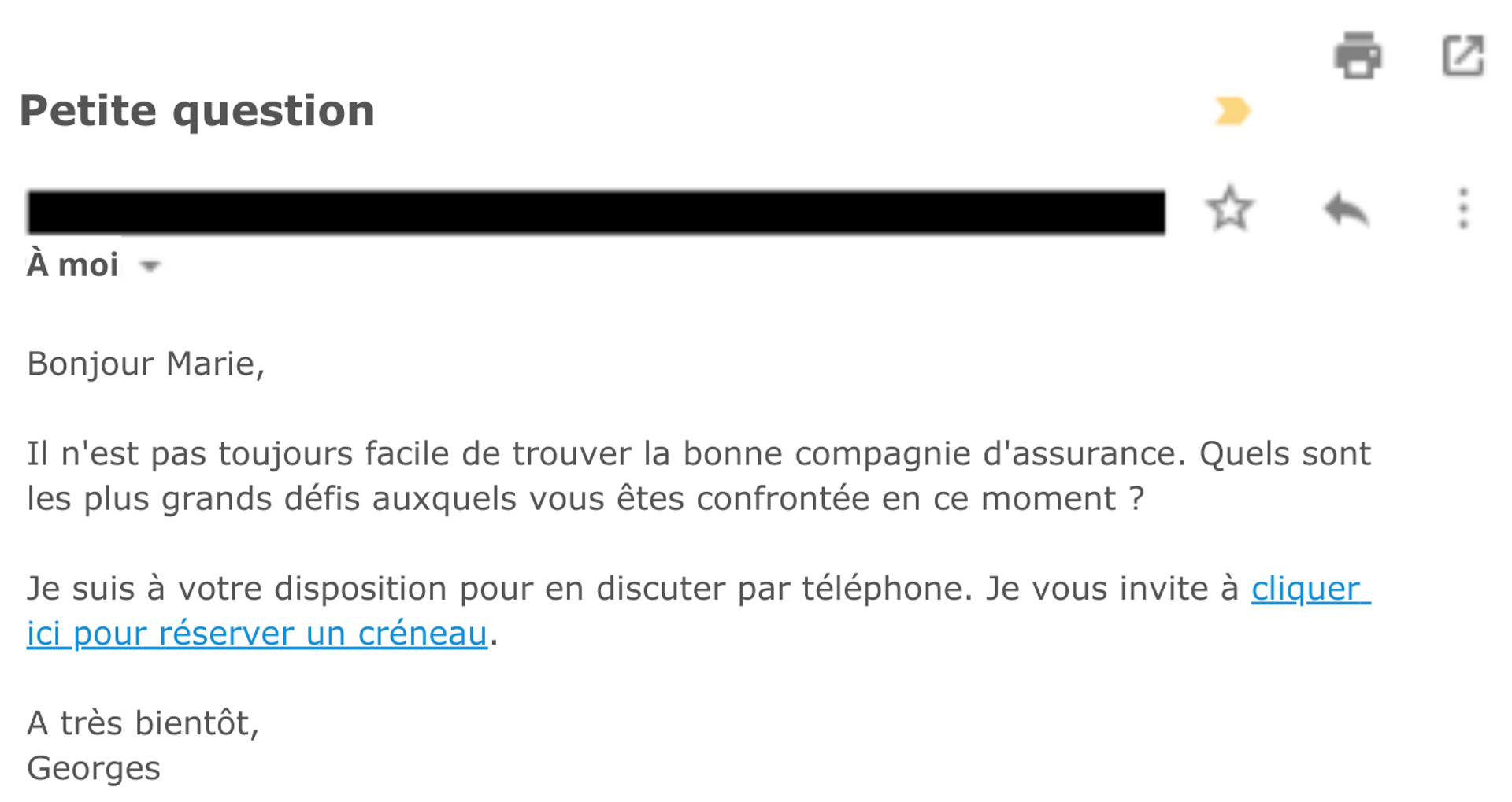 La première partie de cet e-mail ressemble au modèle de prise de contact initiale. Georges propose d’abord de répondre aux questions de Marie et partage le lien pour fixer un rendez-vous.