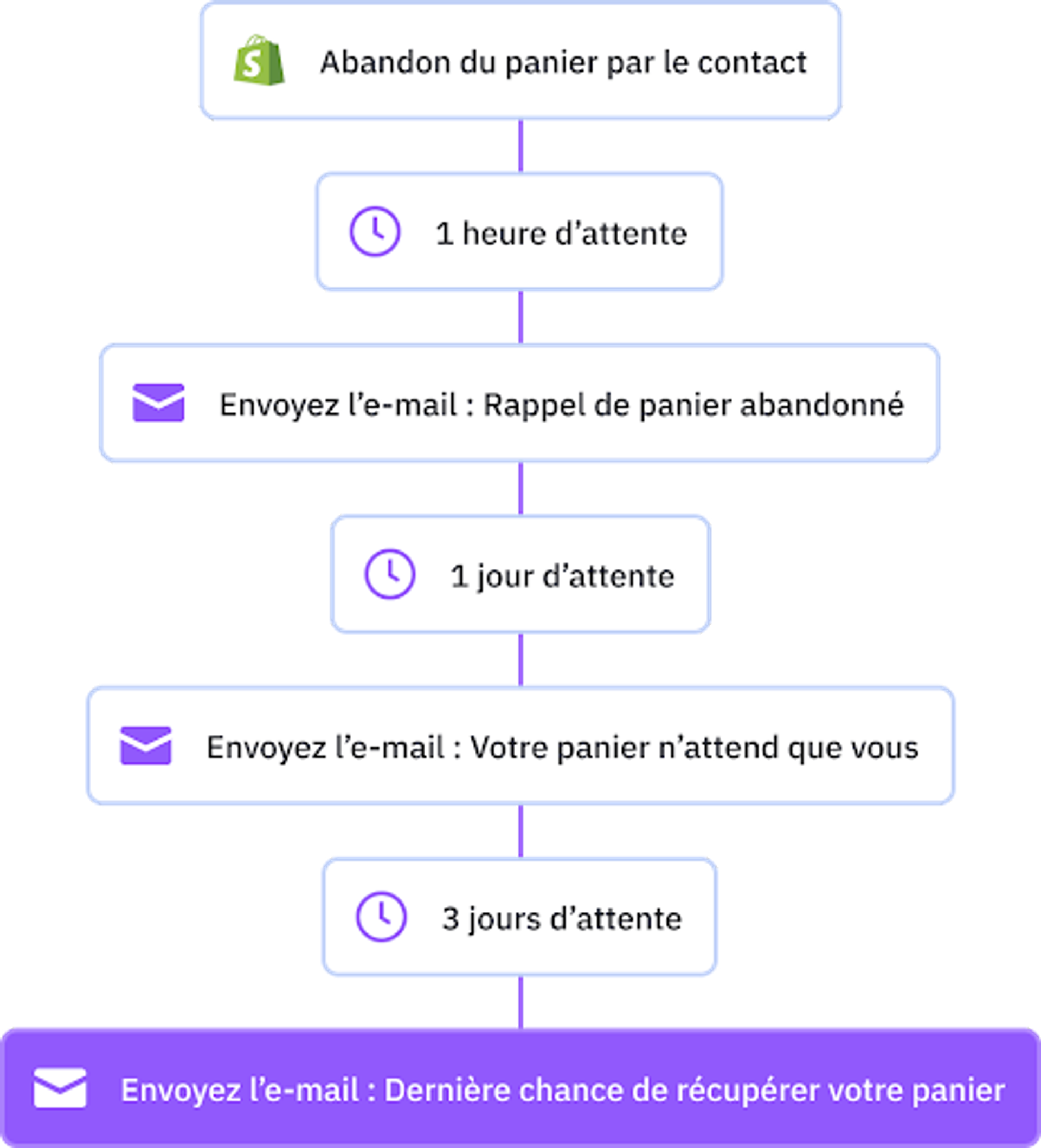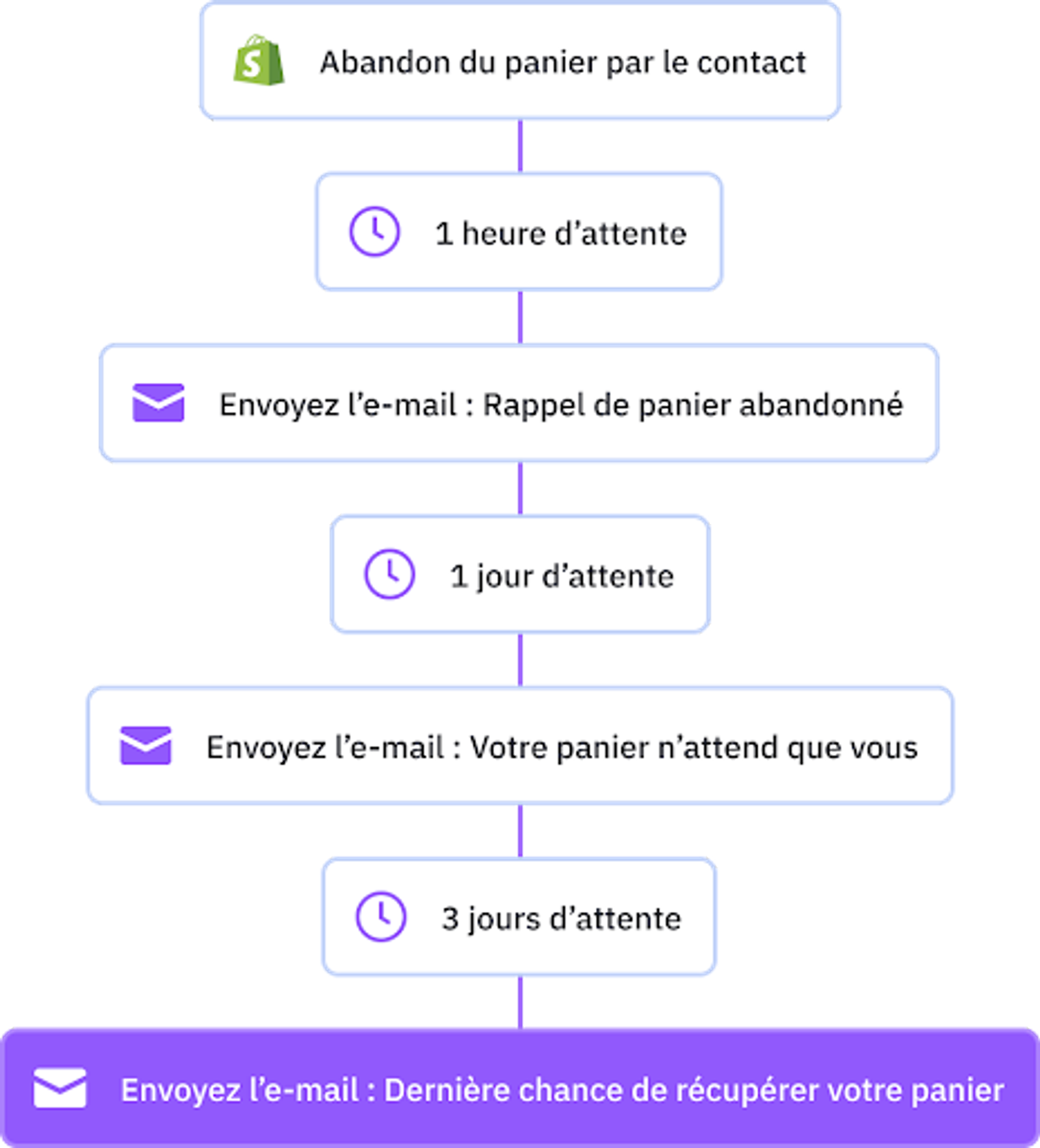 - Crée des e-mails de relance de panier abandonné pour récupérer vos clients ;