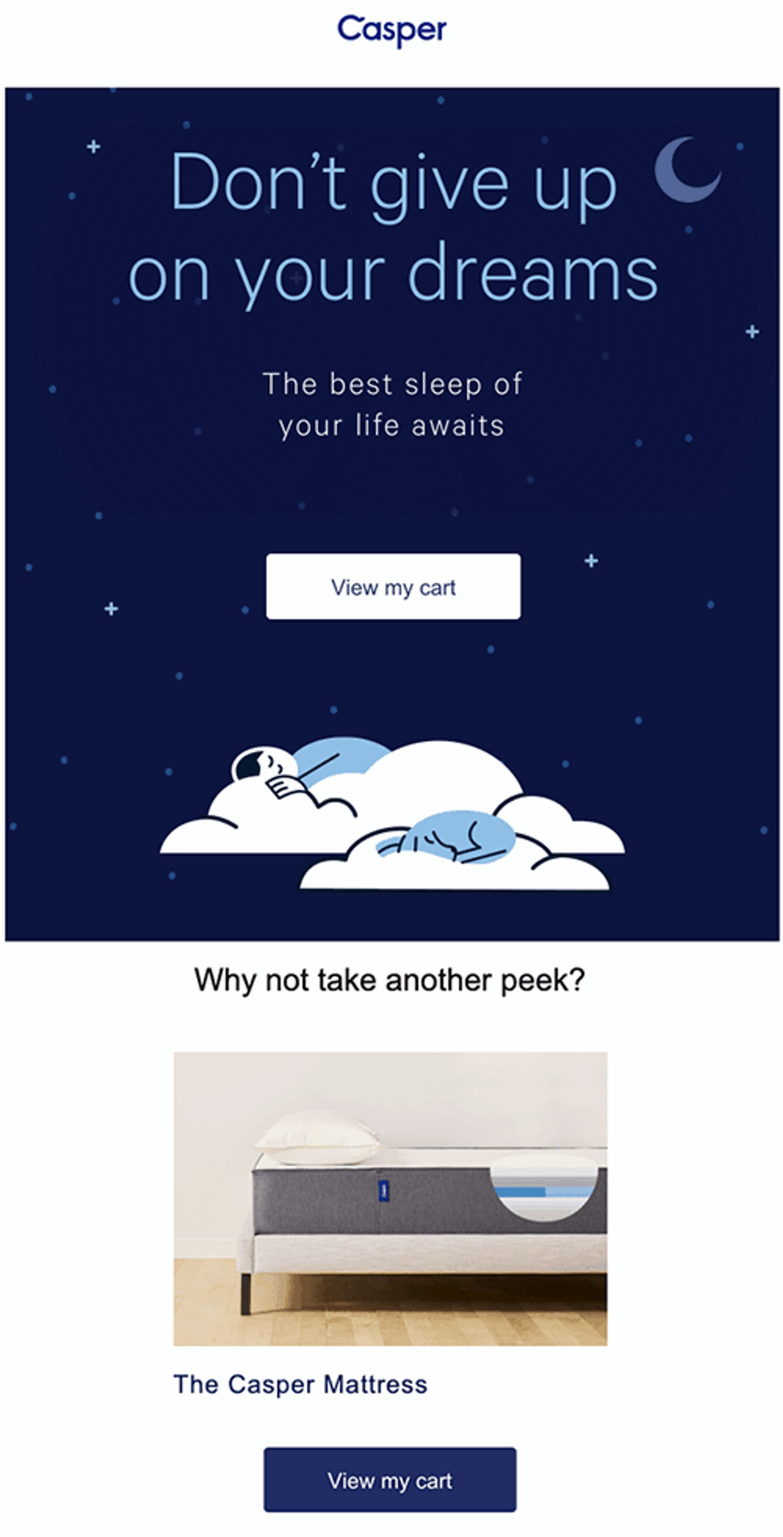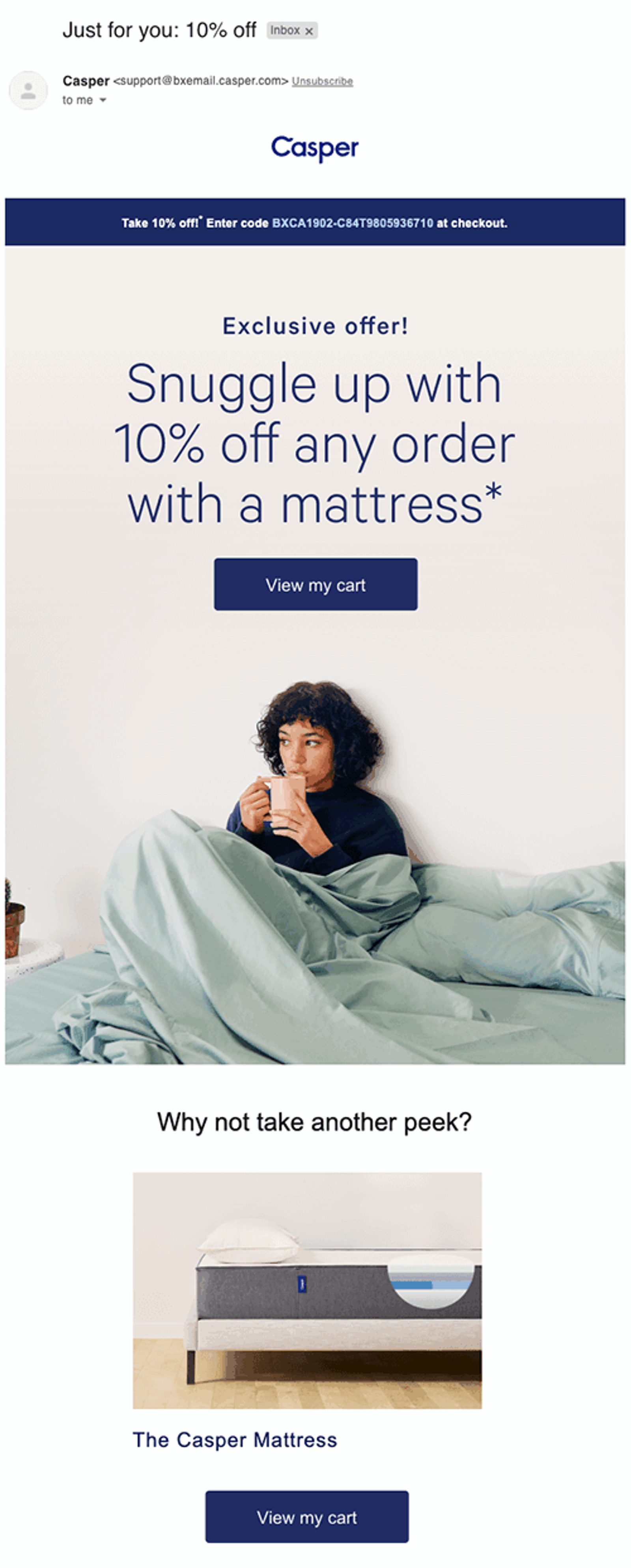 Regardez cette série d’e-mails de Casper. Une heure après avoir décidé que je n’étais pas sûr de vouloir acheter un matelas, ils m’ont envoyé ceci :