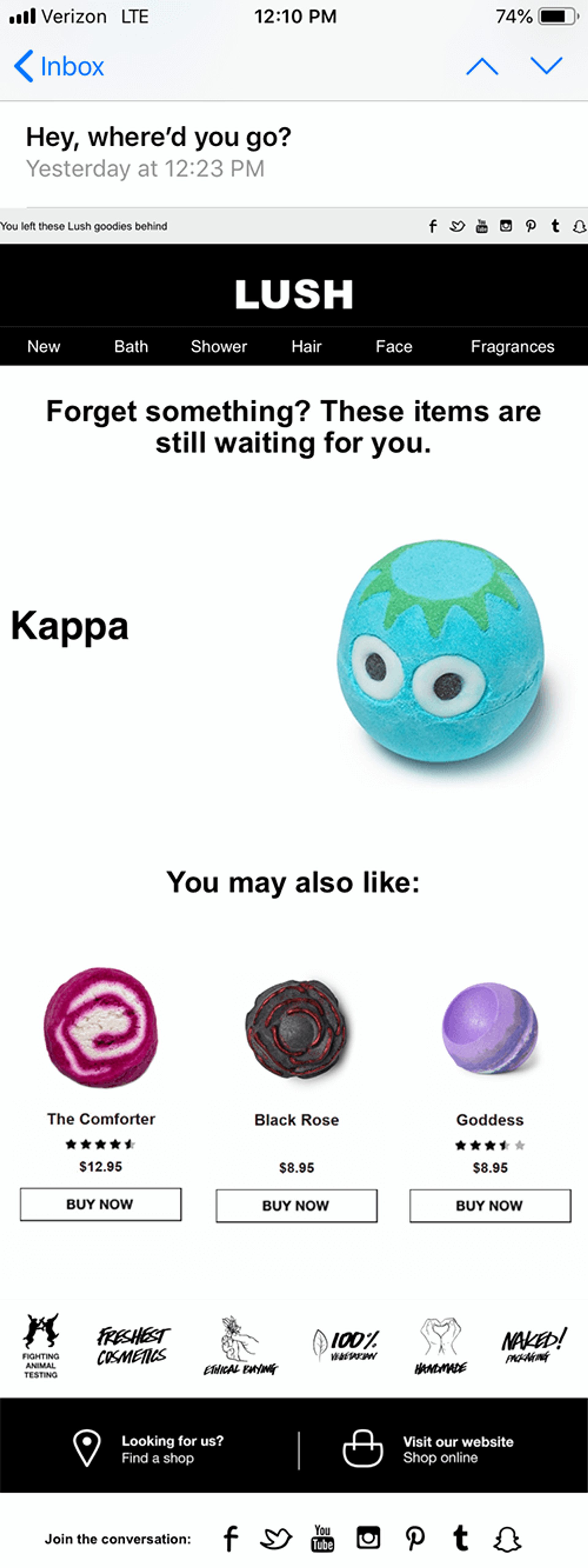 - L’appel à l’action à côté de la photo du produit. Un bouton d’appel à l’action clair à côté de la bombe de bain abandonnée représente un moyen idéal de compléter ce super e-mail.