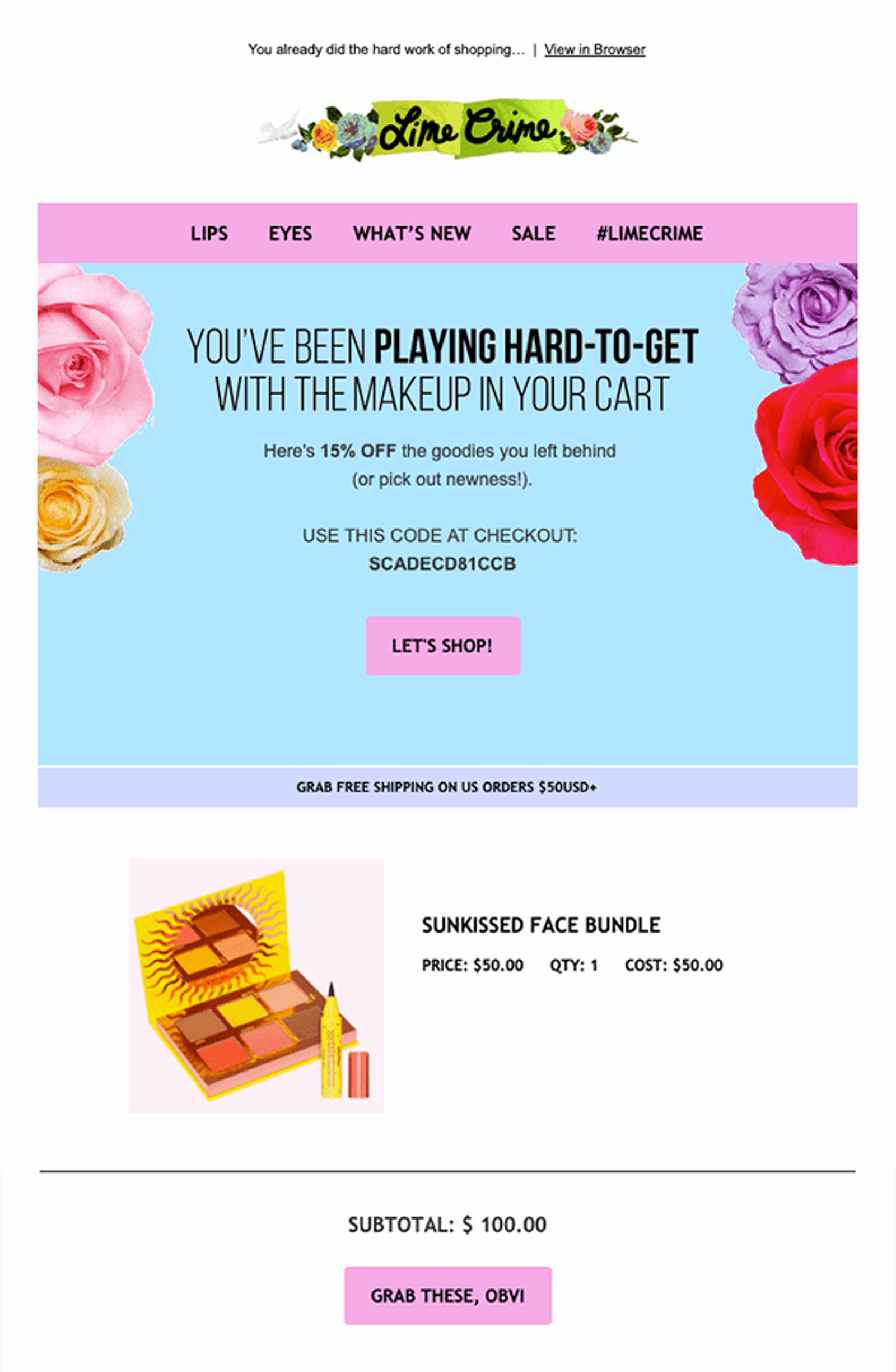 - Lime Crime a attendu le troisième e-mail de panier abandonné pour offrir une remise. Le rappel de la gratuité des frais de port à partir de 50 dollars est une autre incitation.