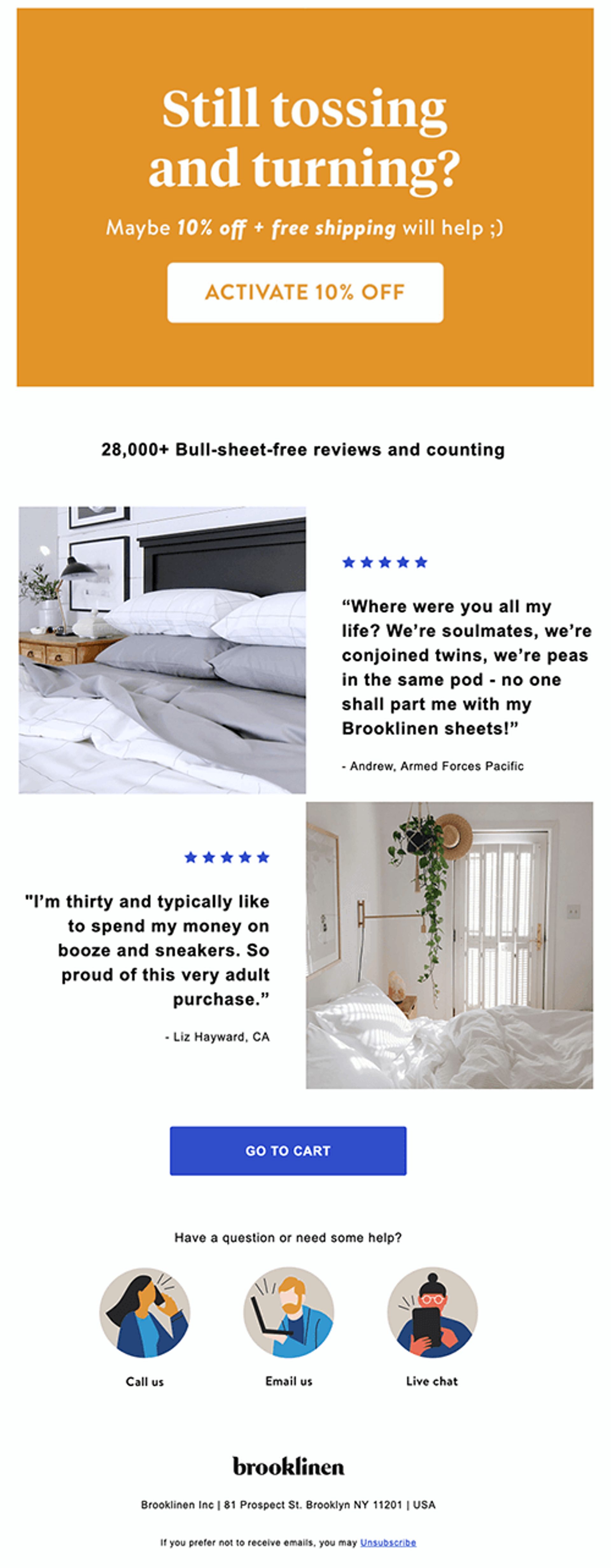 - Brooklinen illustre son slogan « Really Good Sheet » en montrant des avis 5 étoiles. Cela confirme que les articles abandonnés valent la peine d’être achetés.